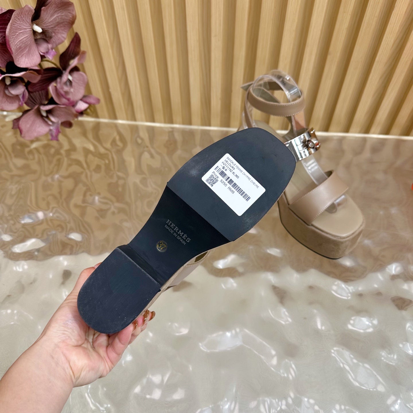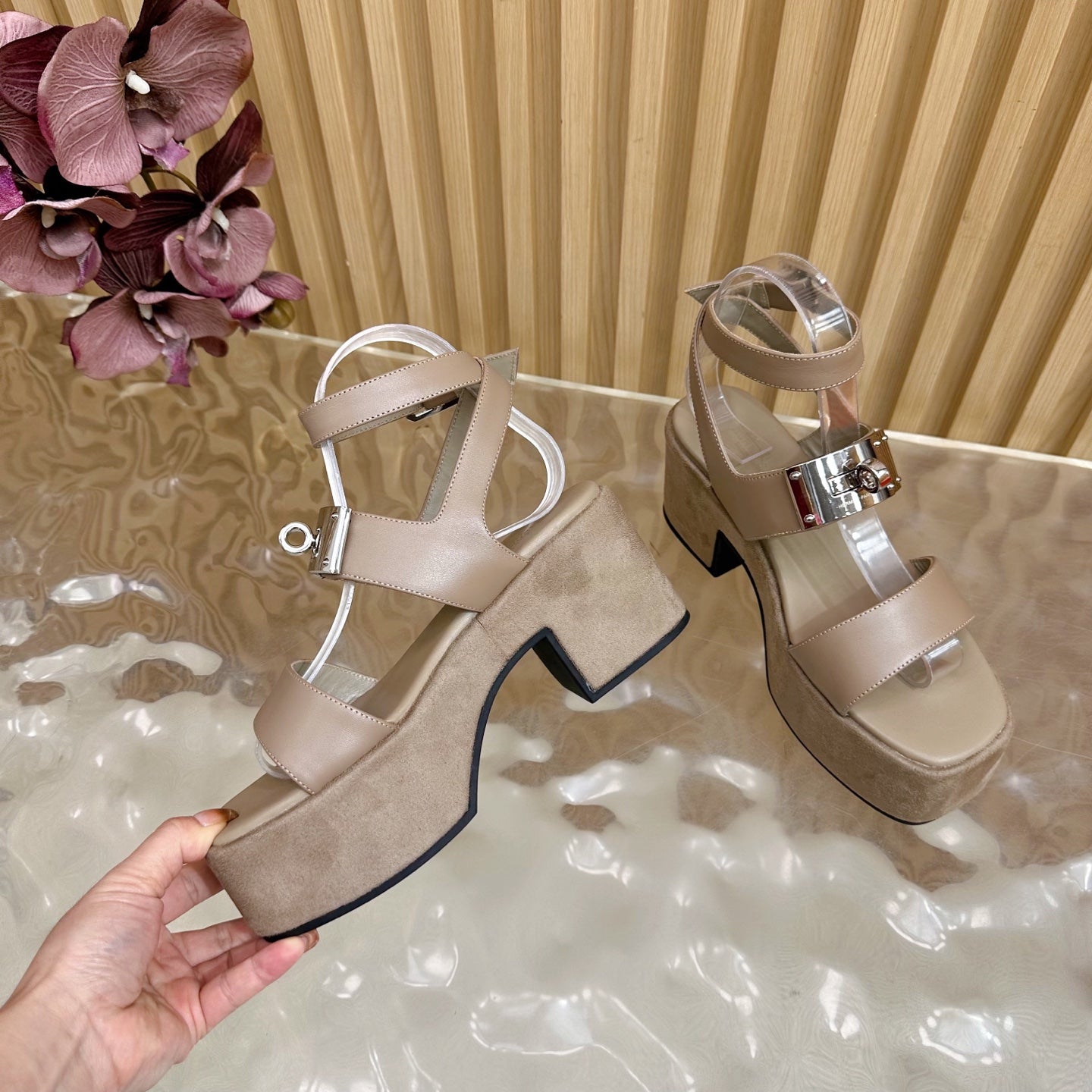HM 25S CLASSIC WEDGE SANDALS 70 MM IN TAUPE BEIGE LAMBSKIN WITH SILVER HARDWARE