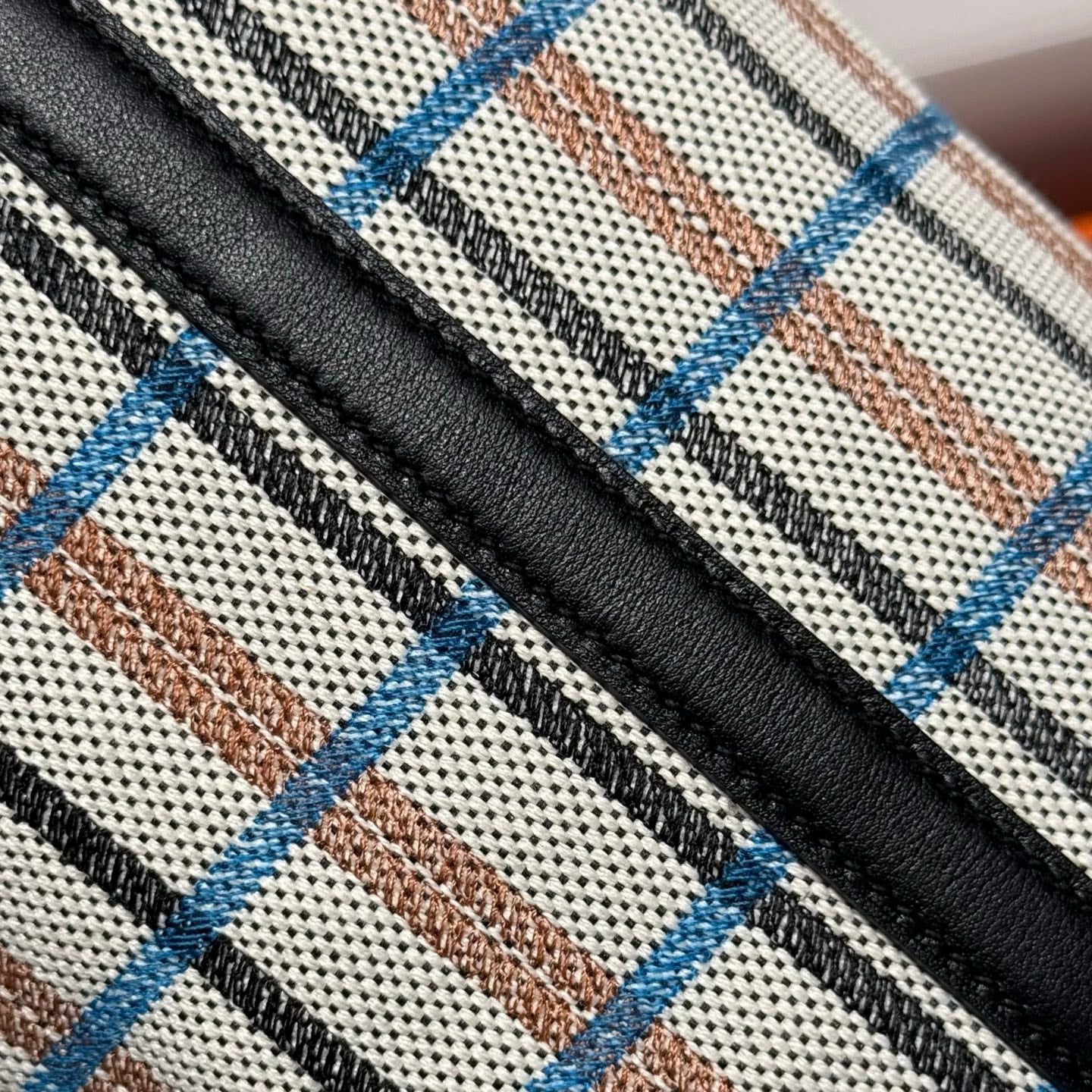 PICOTIN LOCK 18 BAG IN BLACK CALFSKIN ÉCRU/NOIR/FAUVE/NOIR/BLEU ZANZIBAR EMBROIDERY PLAID CANVAS