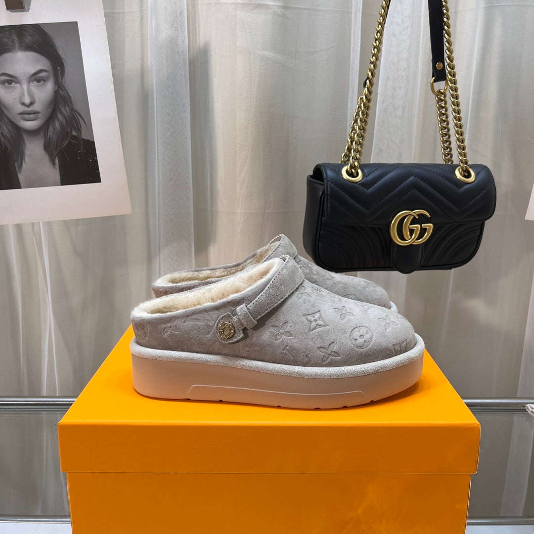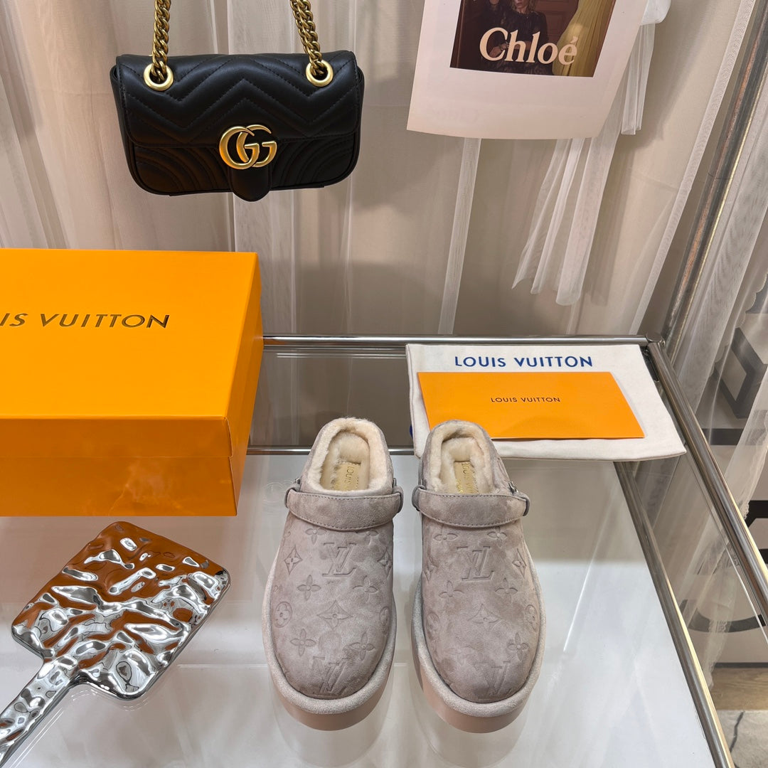 LV WOMEN'S COSY FLAT COMFORT CLOGS IN BEIGE MONOGRAM SUEDE