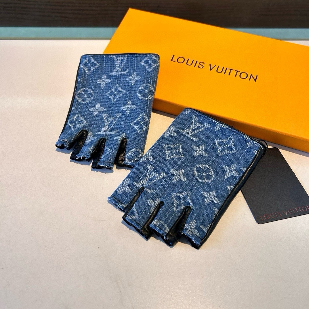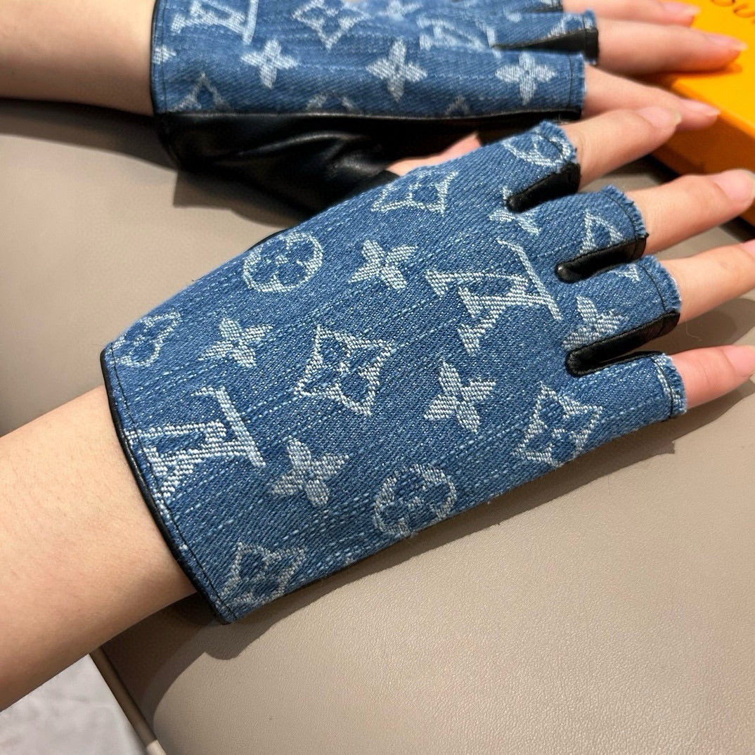 FINGERLESS GLOVES IN ELECTRIC BLUE MONOGRAM DENIM AND BLACK LAMBSKIN 460107