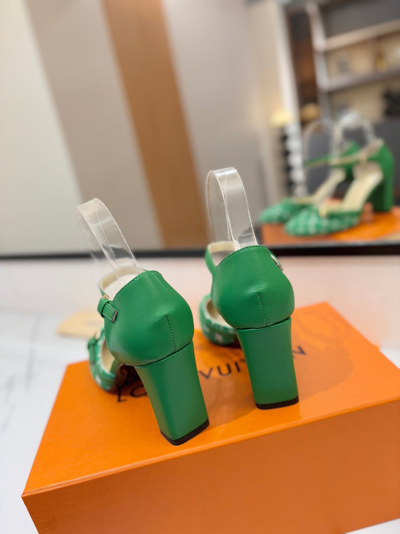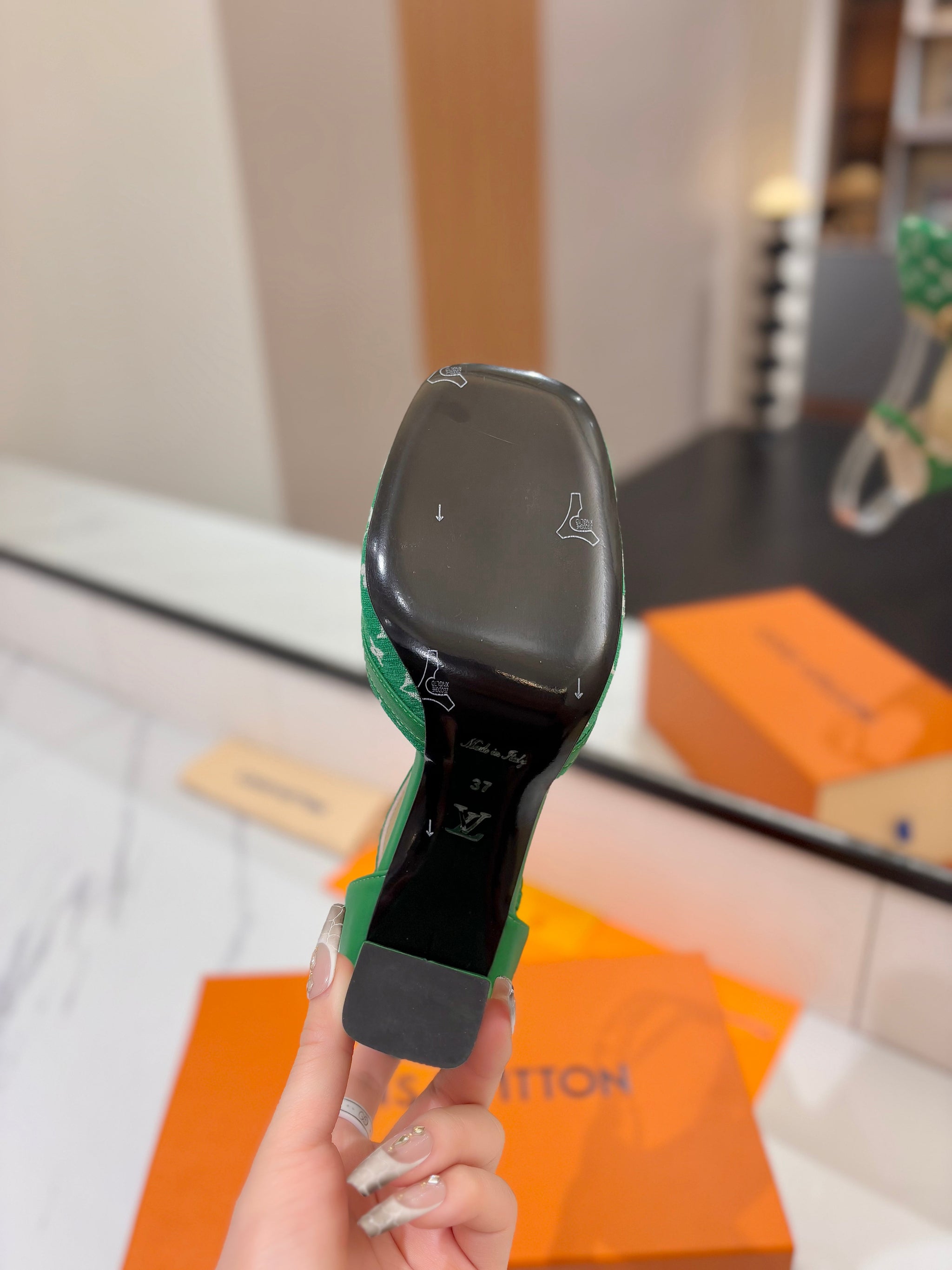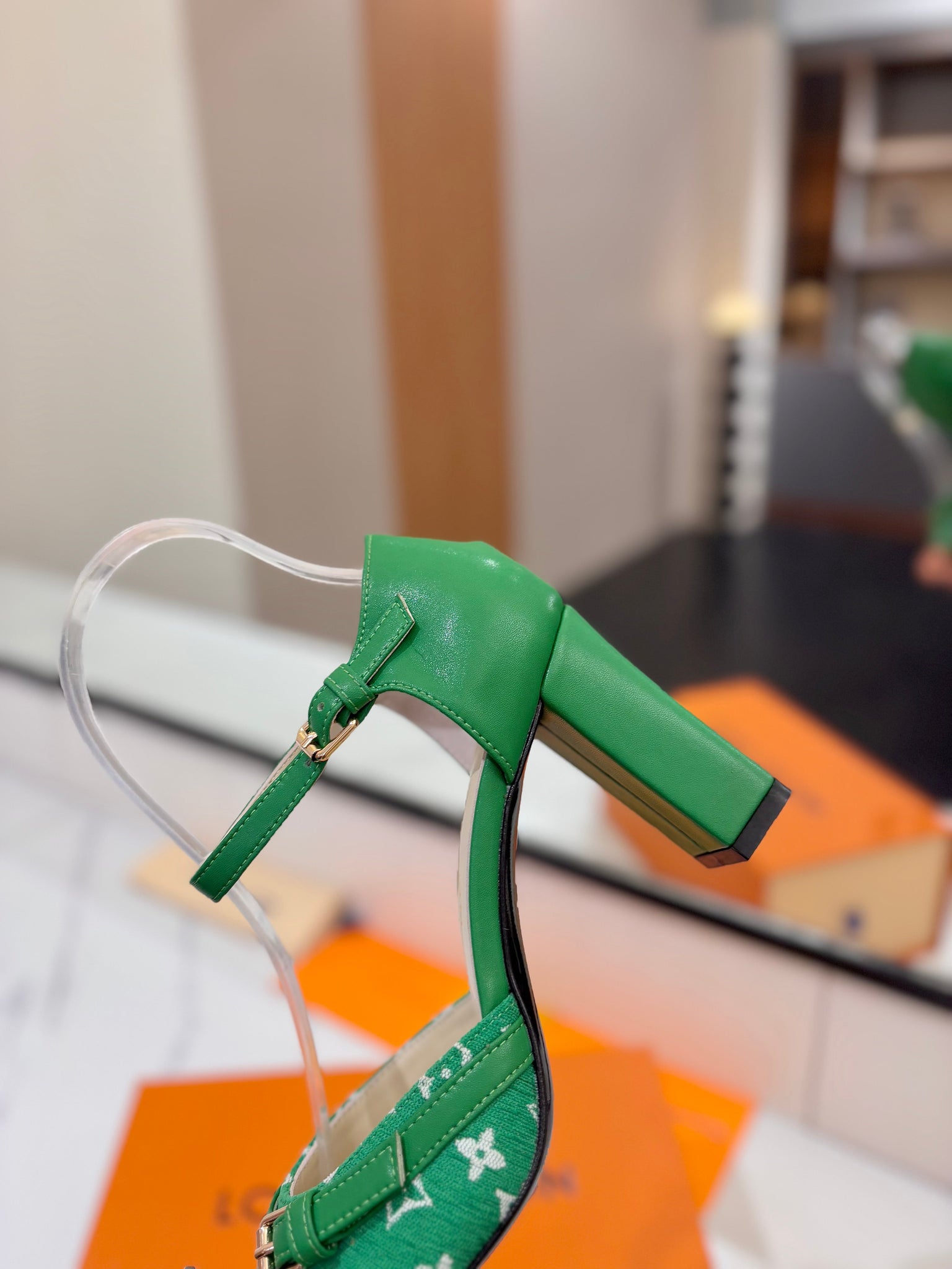 HIGH SANDALS 8 CM IN EMERALD GREEN MONOGRAM DENIM AND CALFSKIN
