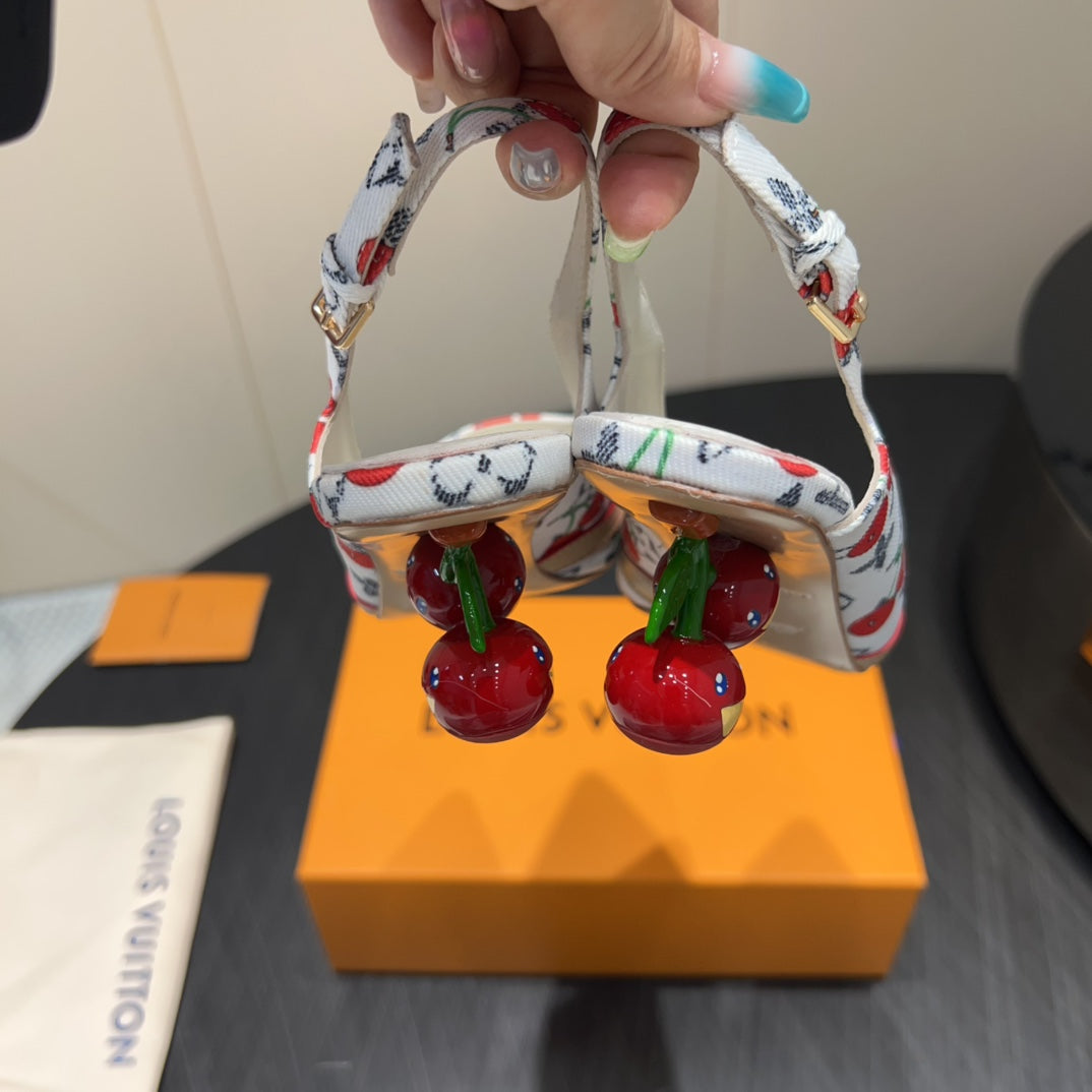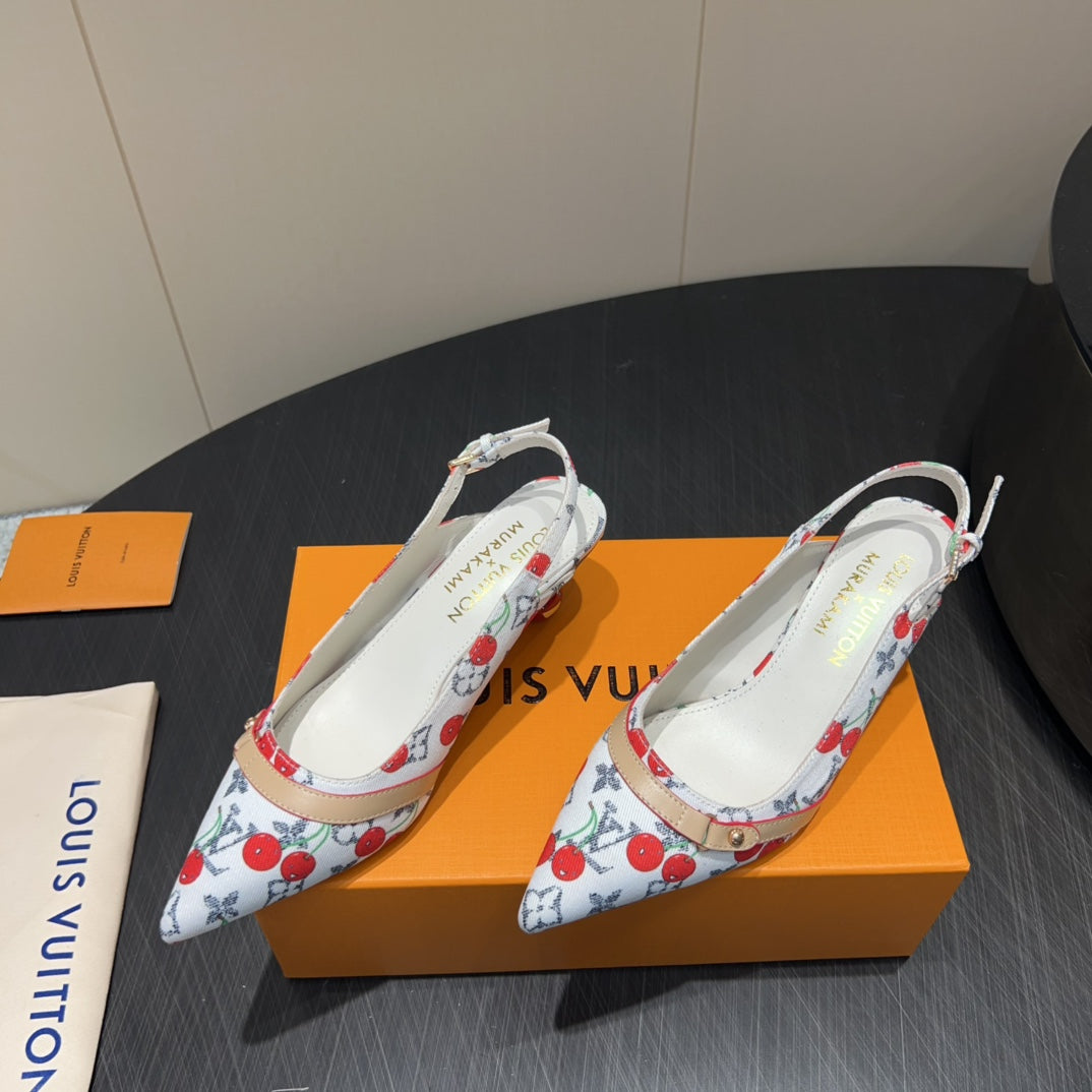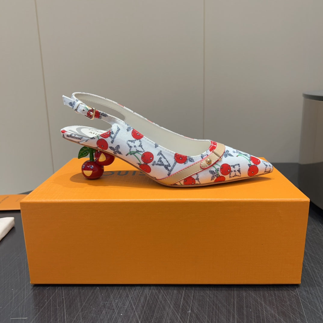 LV HIGH SLINGBACK LOGO AND CHERRY PRINT 25S 55MM IN WHITE DENIM