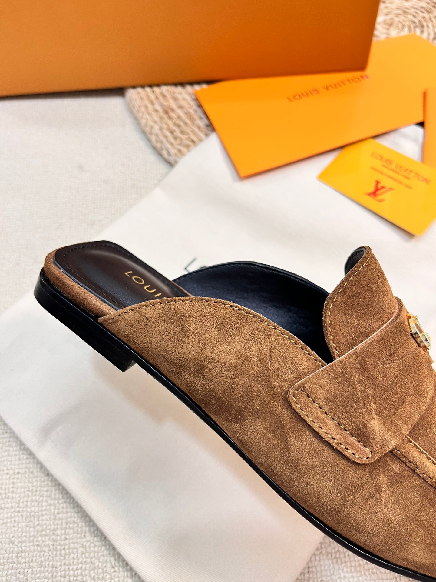 LV CAPRI OPEN BACK LOAFERS IN CHOCOLATE BROWN SUEDE