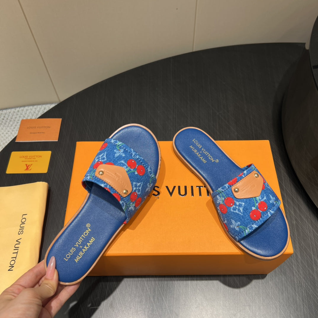 LV SLIDE SANDALS 25S IN DARK BLUE DENIM AND CALFSKIN WITH LOGO PRINT