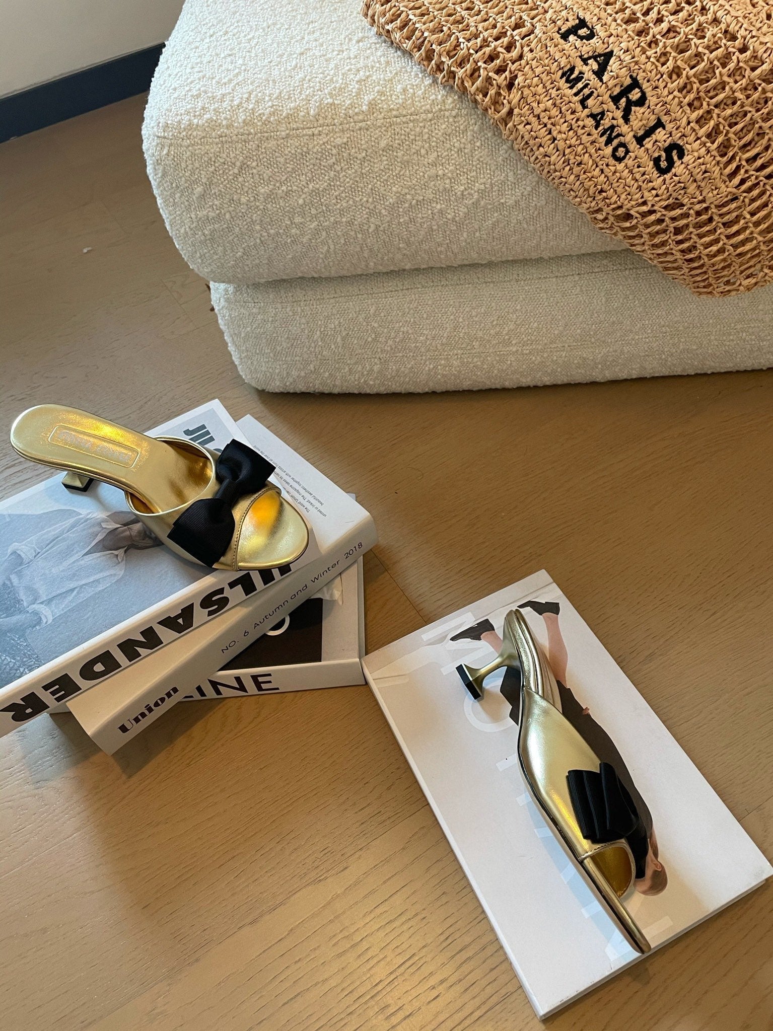 Metallic Gold High - Heels With Black Bow Calfskin