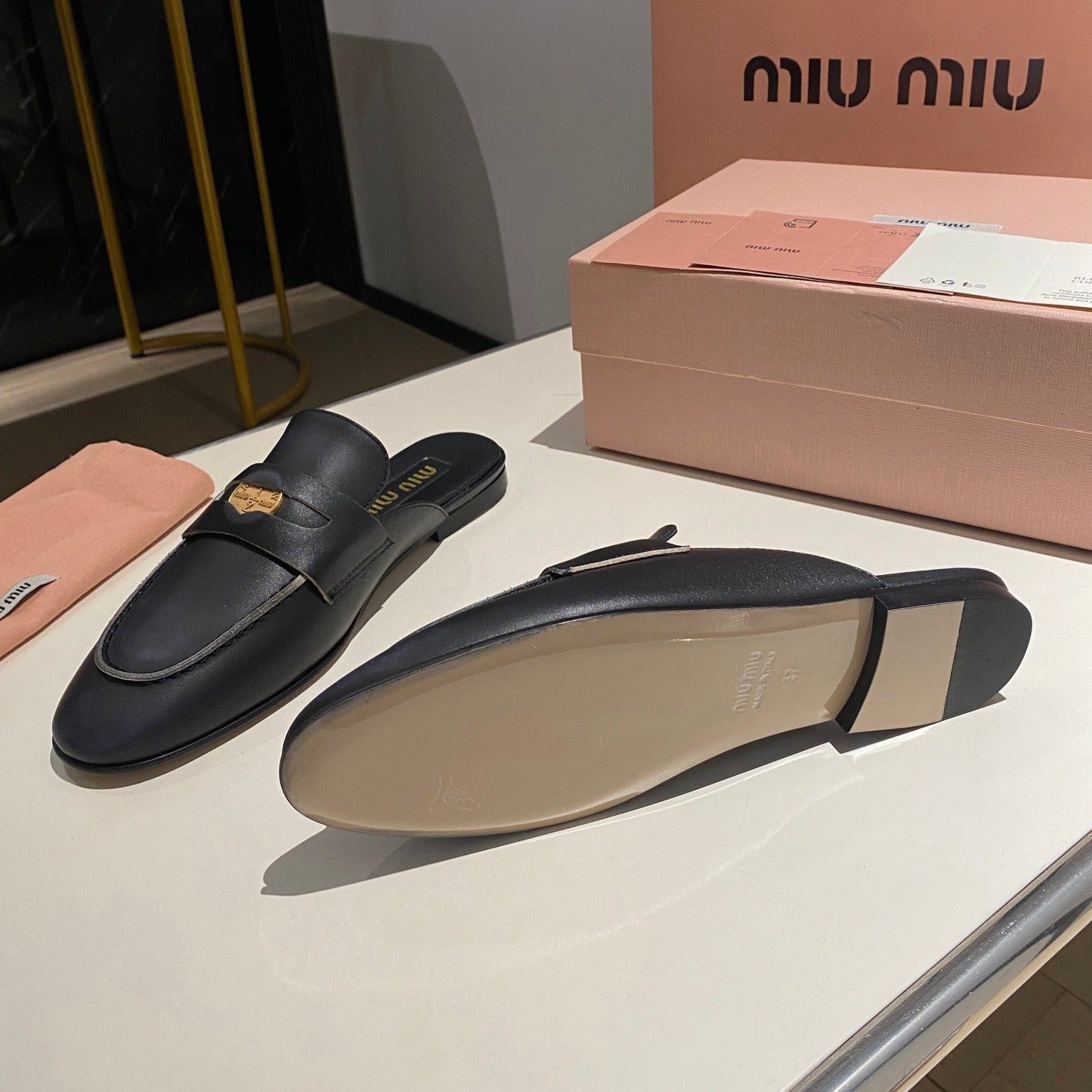 MULES SLIPPERS BLACK COWHIDE WITH GOLD COIN