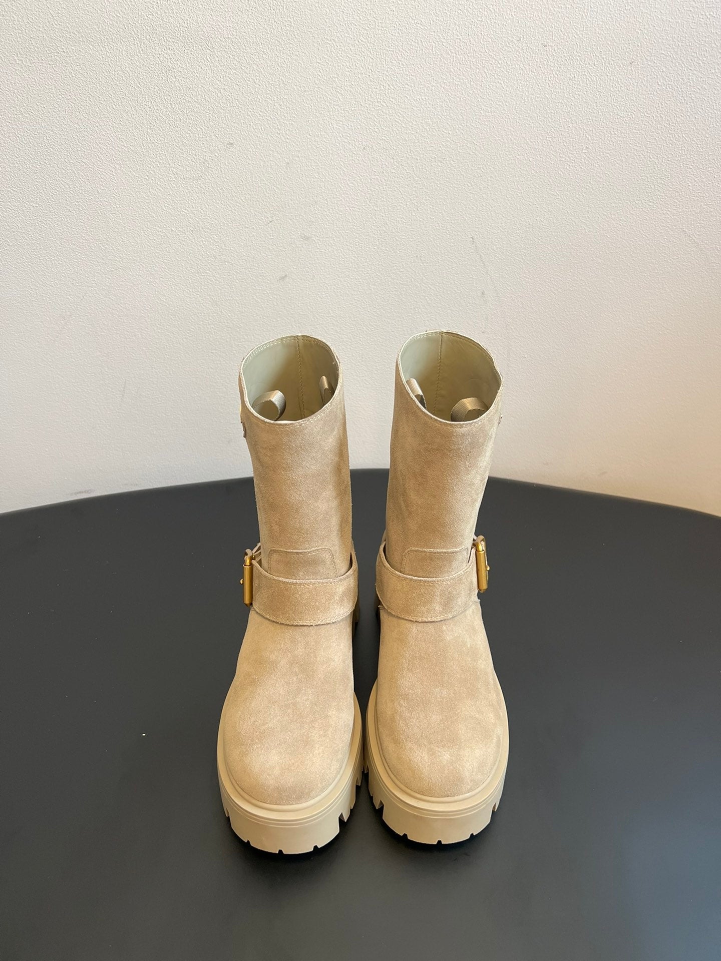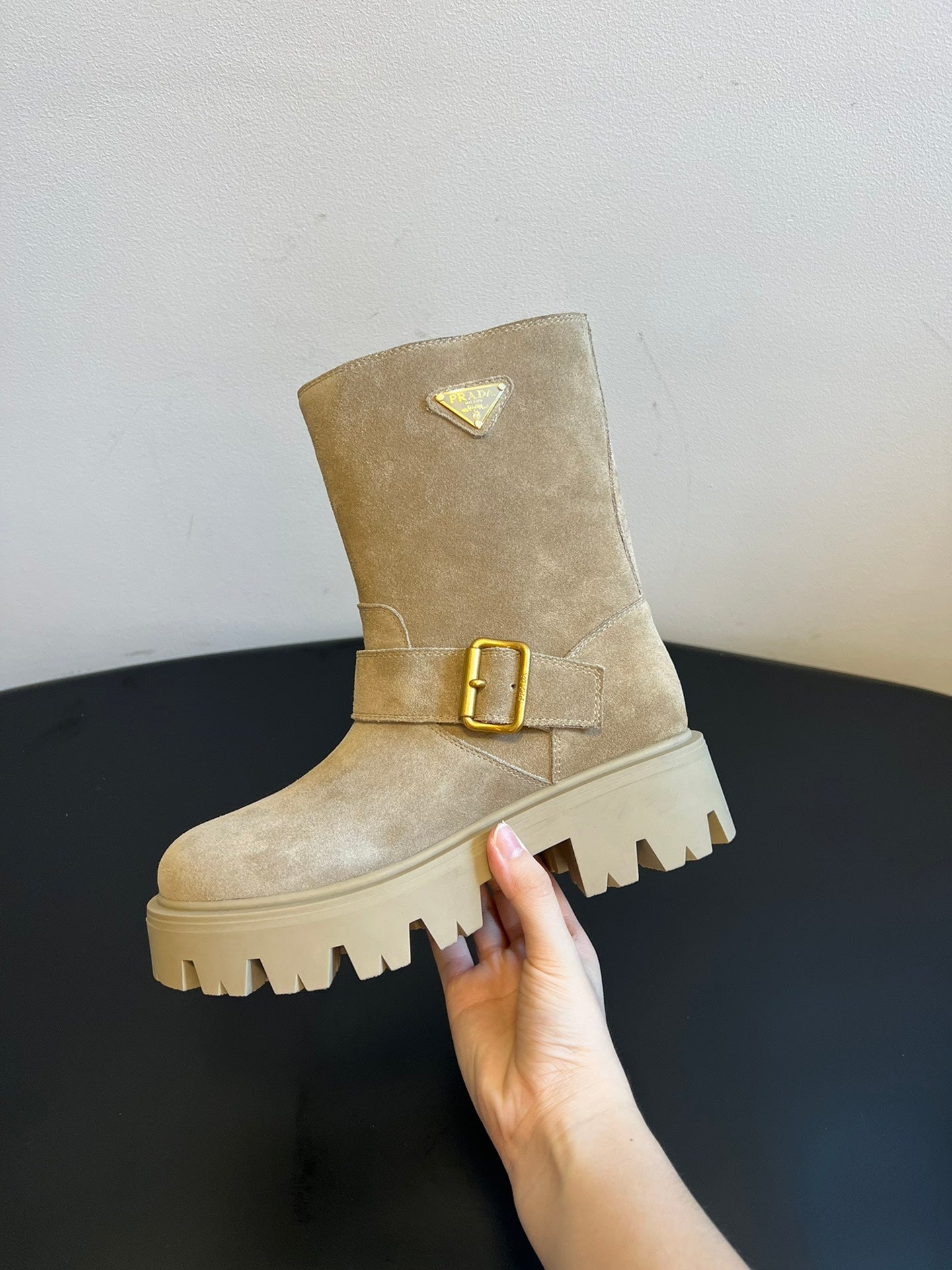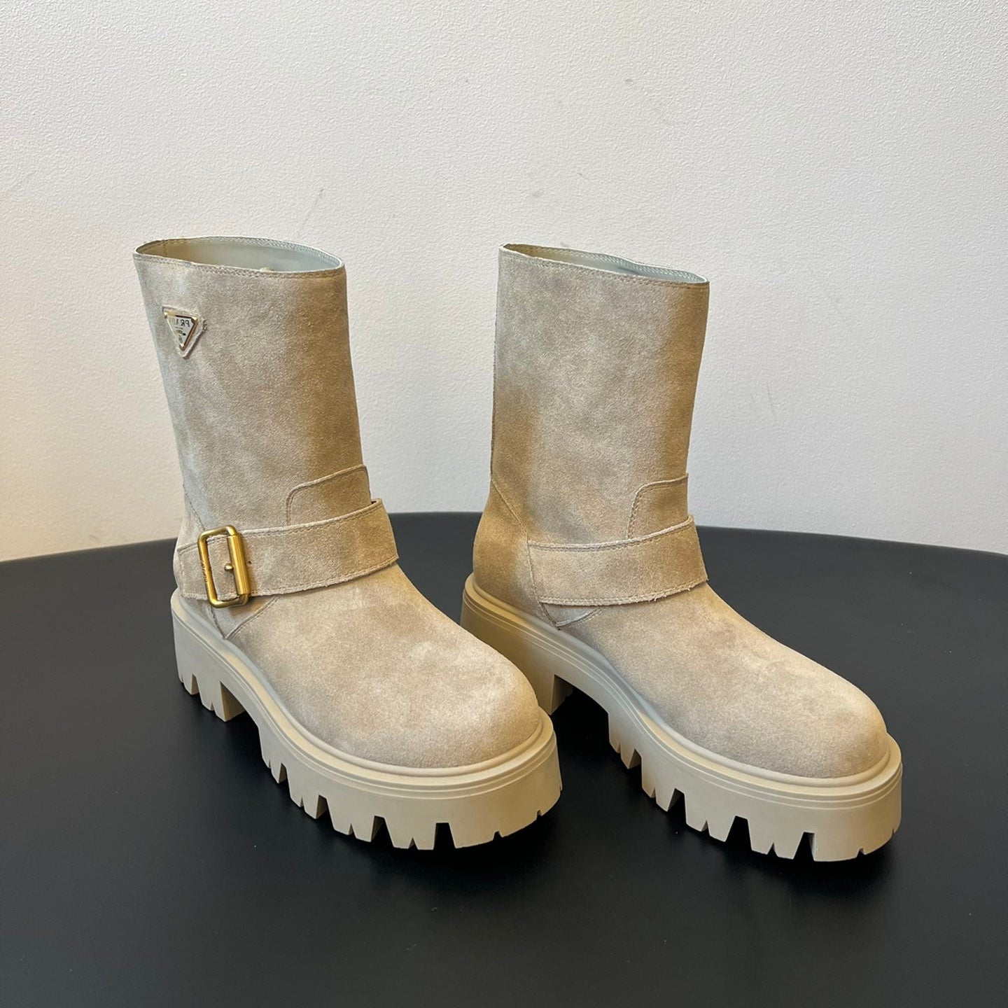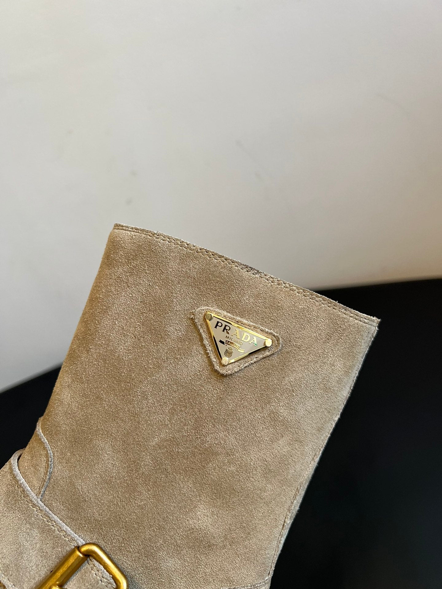 PRADA 25S PLATFORM ANKLE BOOTS IN BEIGE SUEDE WITH GOLD HARDWARE