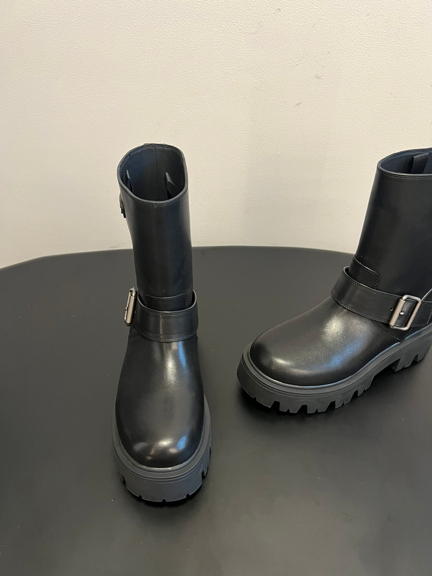 PRADA 25S PLATFORM ANKLE BOOTS IN BLACK CALFSKIN WITH SILVER HARDWARE