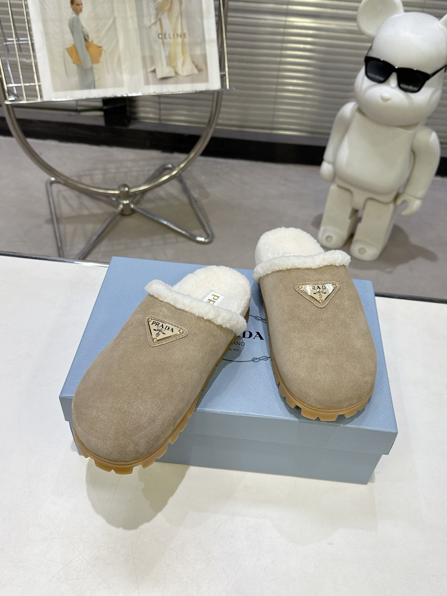 PRADA 25S FUR-LINED SABOT MULES IN BEIGE SUEDE