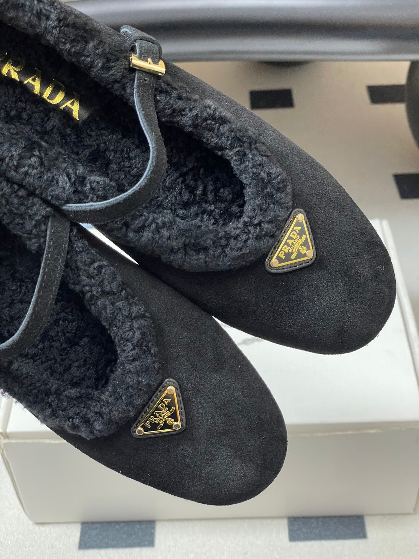 PRADA 25S MARY JANE FLATS IN BLACK SUEDE WITH GOLD HARDWARE