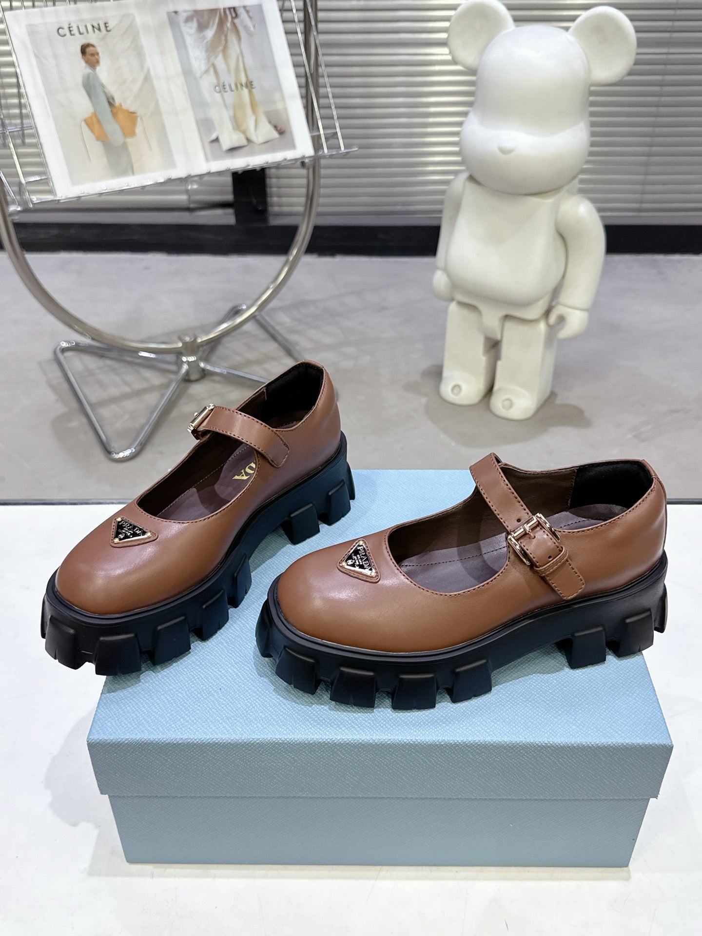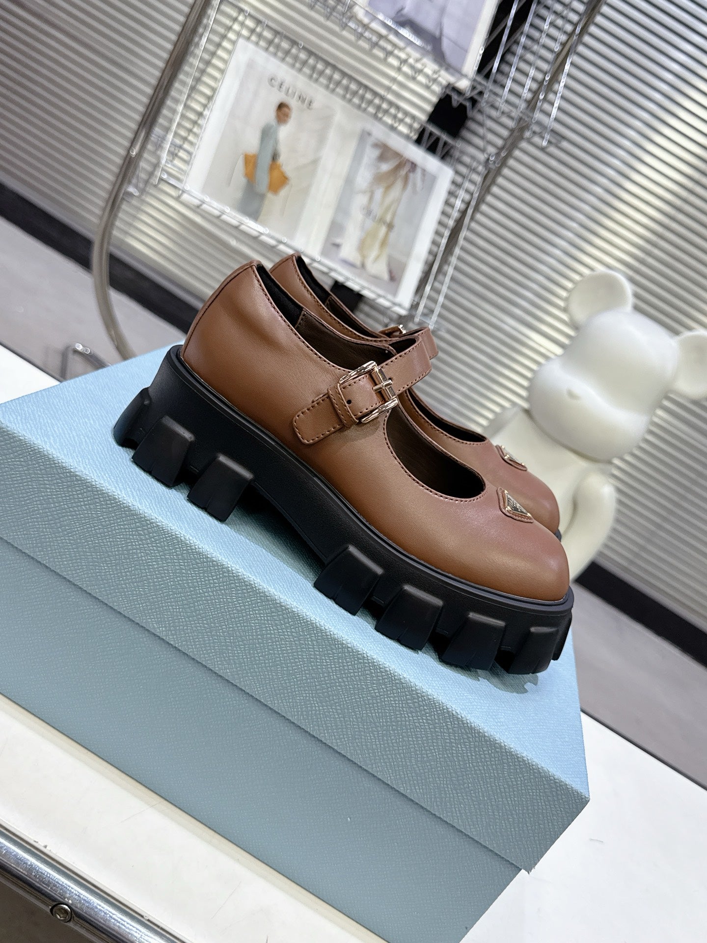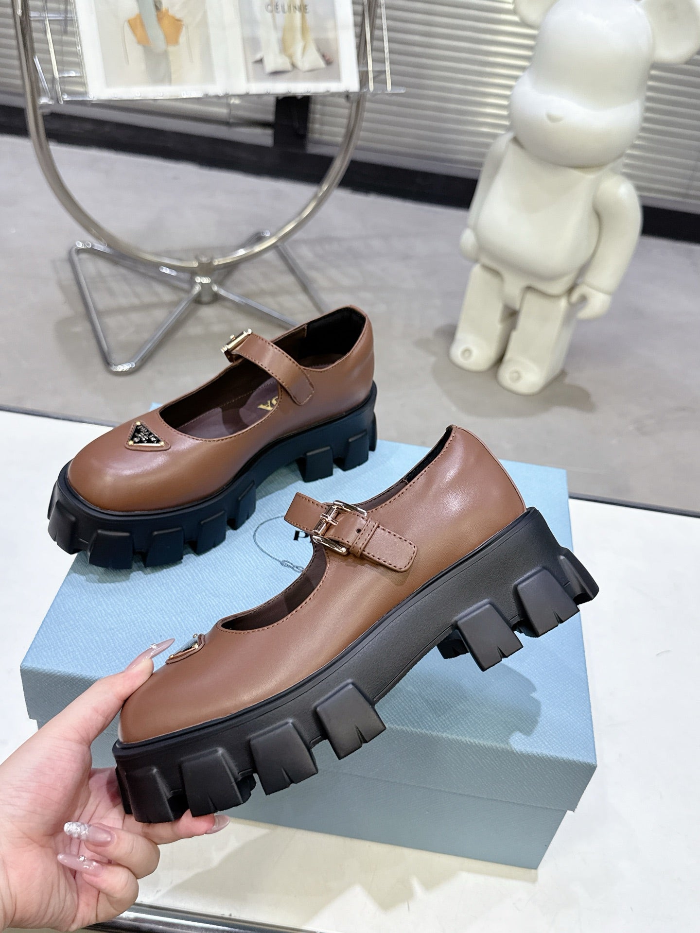 PRADA 25S PLATFORM MARY JANE SHOES IN BROWN CALFSKIN
