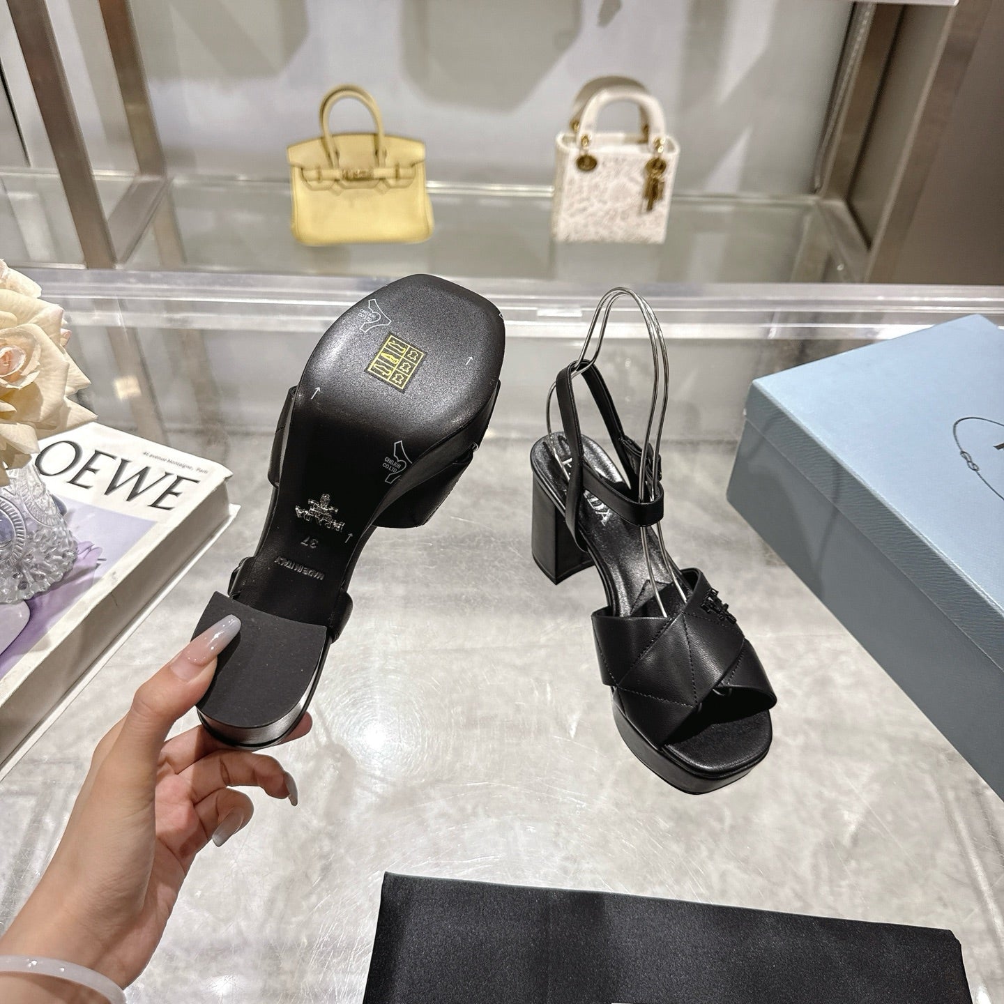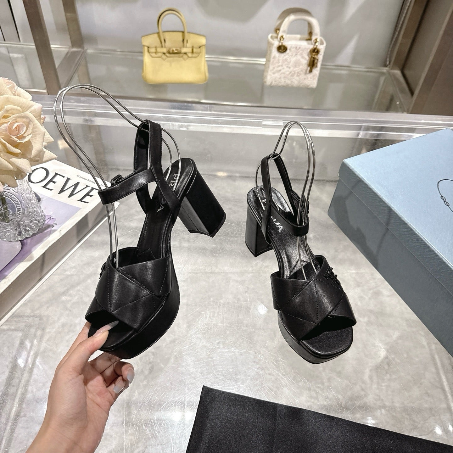 PRADA 25S HIGH-HEEL SANDALS 85 MM IN BLACK LAMBSKIN