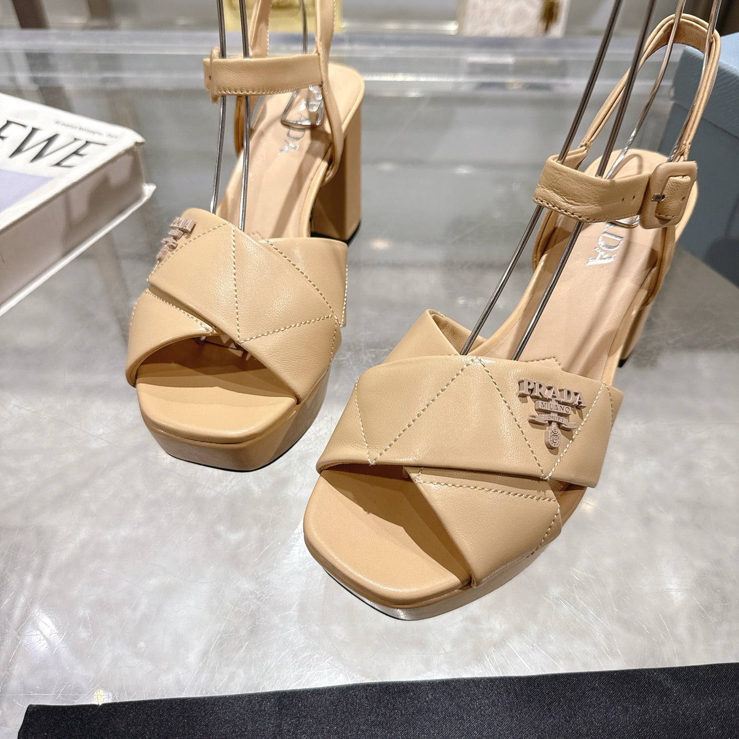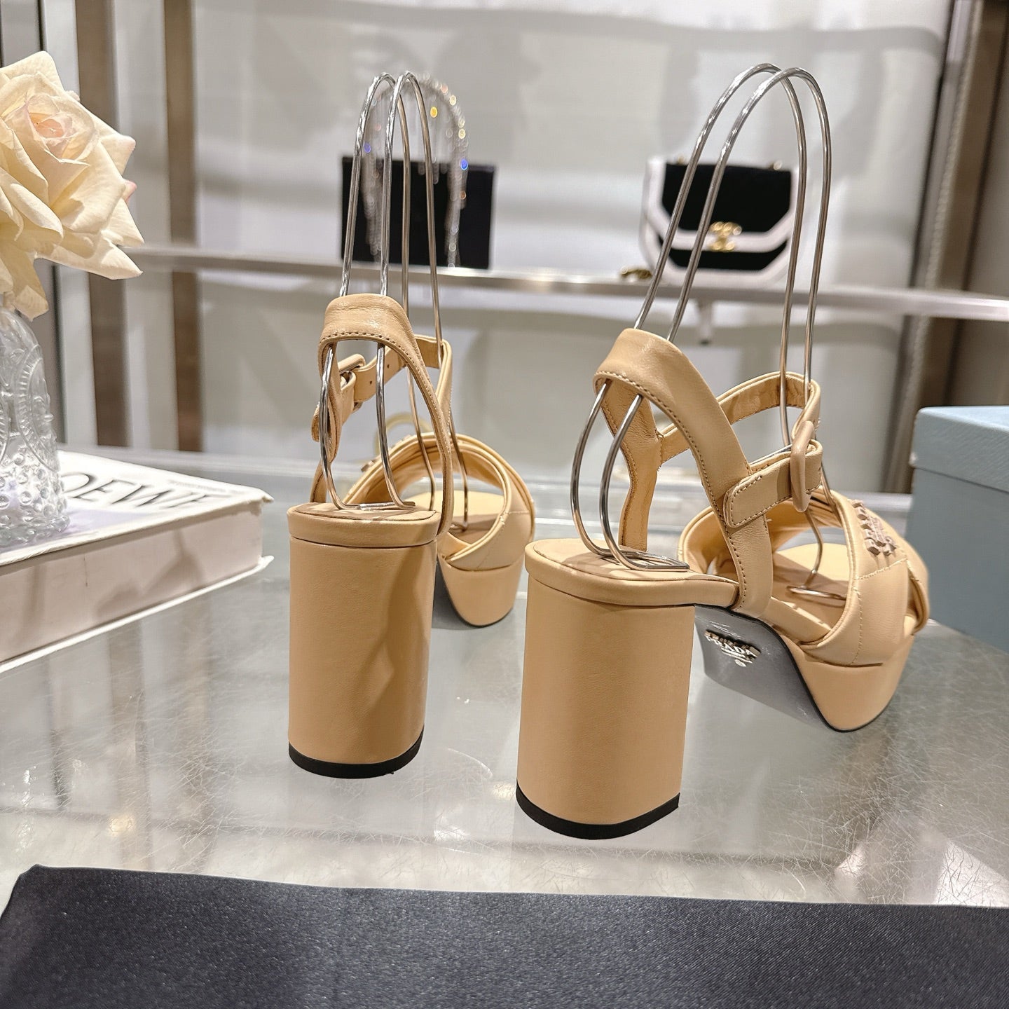 PRADA 25S HIGH-HEEL SANDALS 85 MM IN LIGHT WARM BEIGE LAMBSKIN