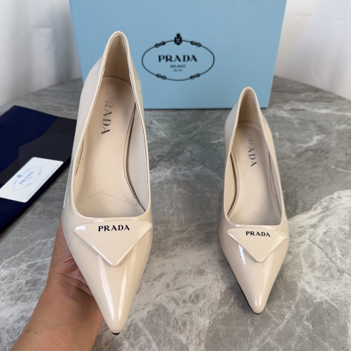 PRADA 25S POINTED-TOE HIGH HEELS 55 MM IN BEIGE GLOSSY LAMBSKIN