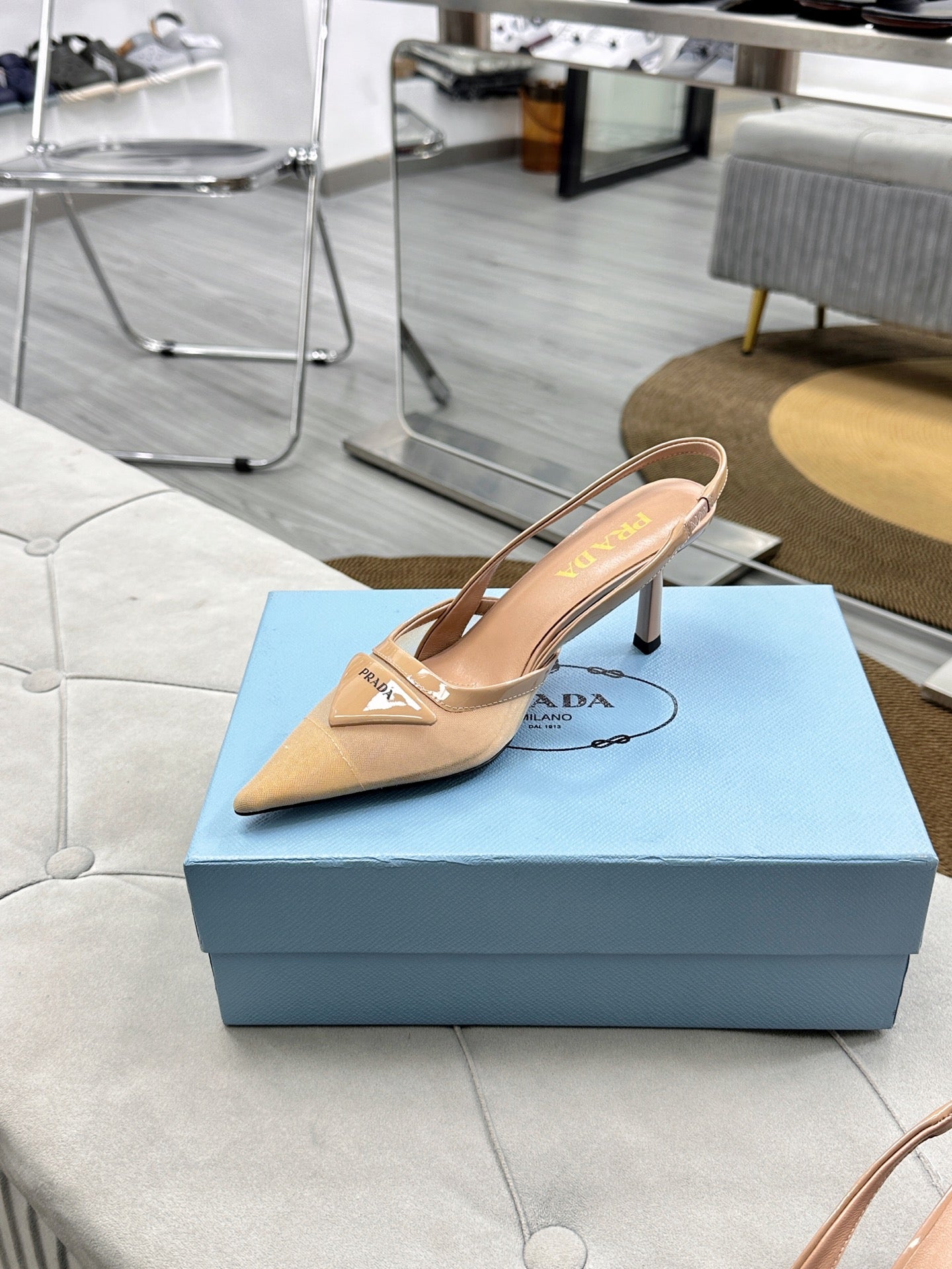 PRADA 25S TRIANGLE LOGO SLINGBACK PUMPS IN BEIGE MESH FABRIC