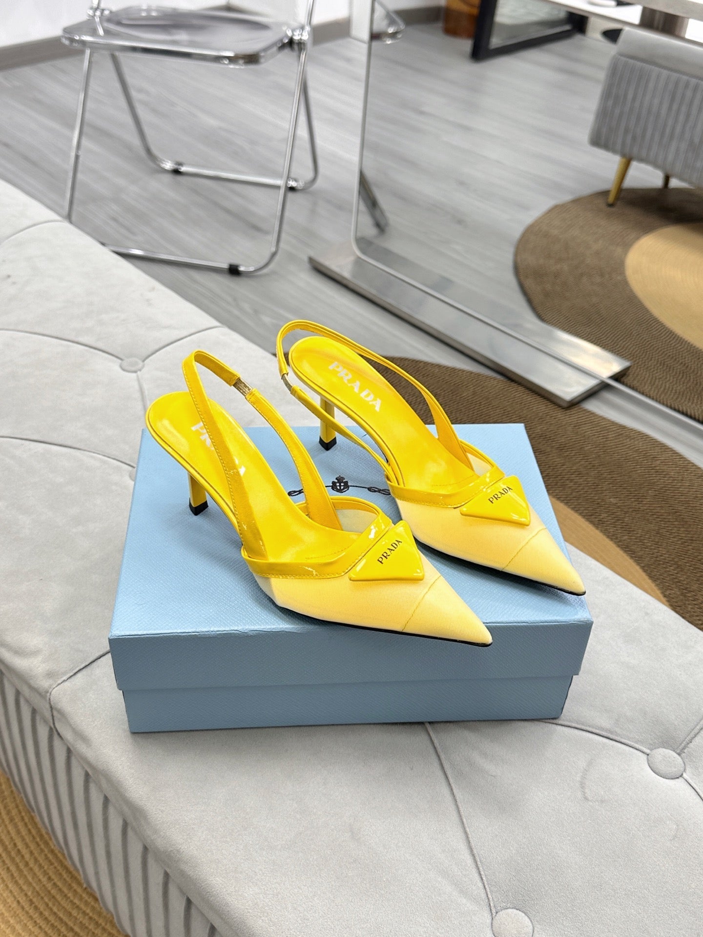 PRADA 25S TRIANGLE LOGO SLINGBACK PUMPS IN YELLOW MESH FABRIC