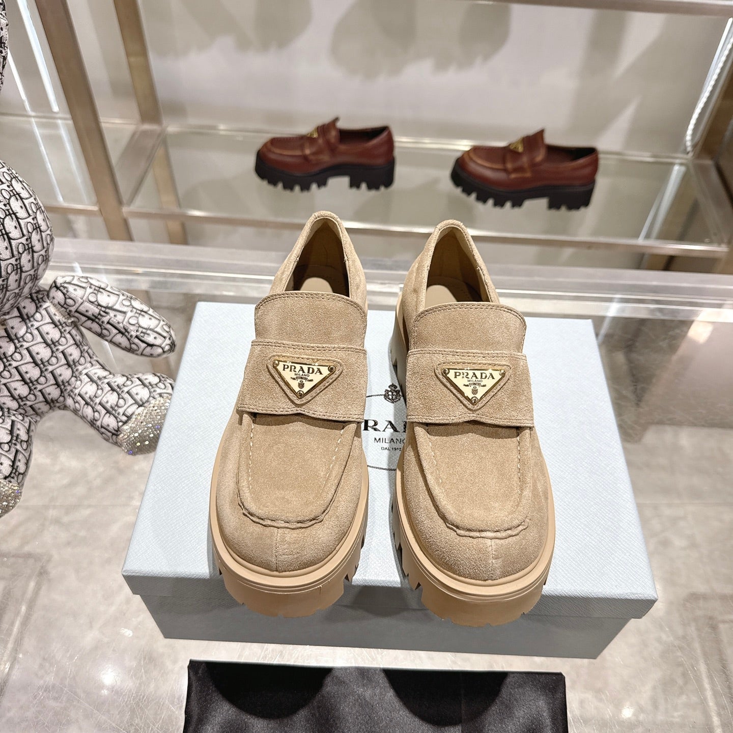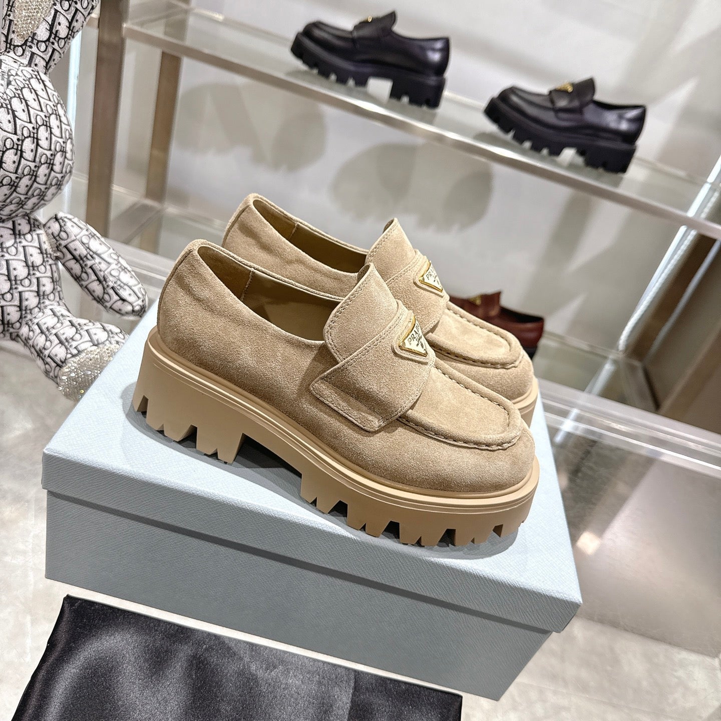 PRADA 25S THICK-SOLE LOAFERS 60 MM IN BEIGE SUEDE