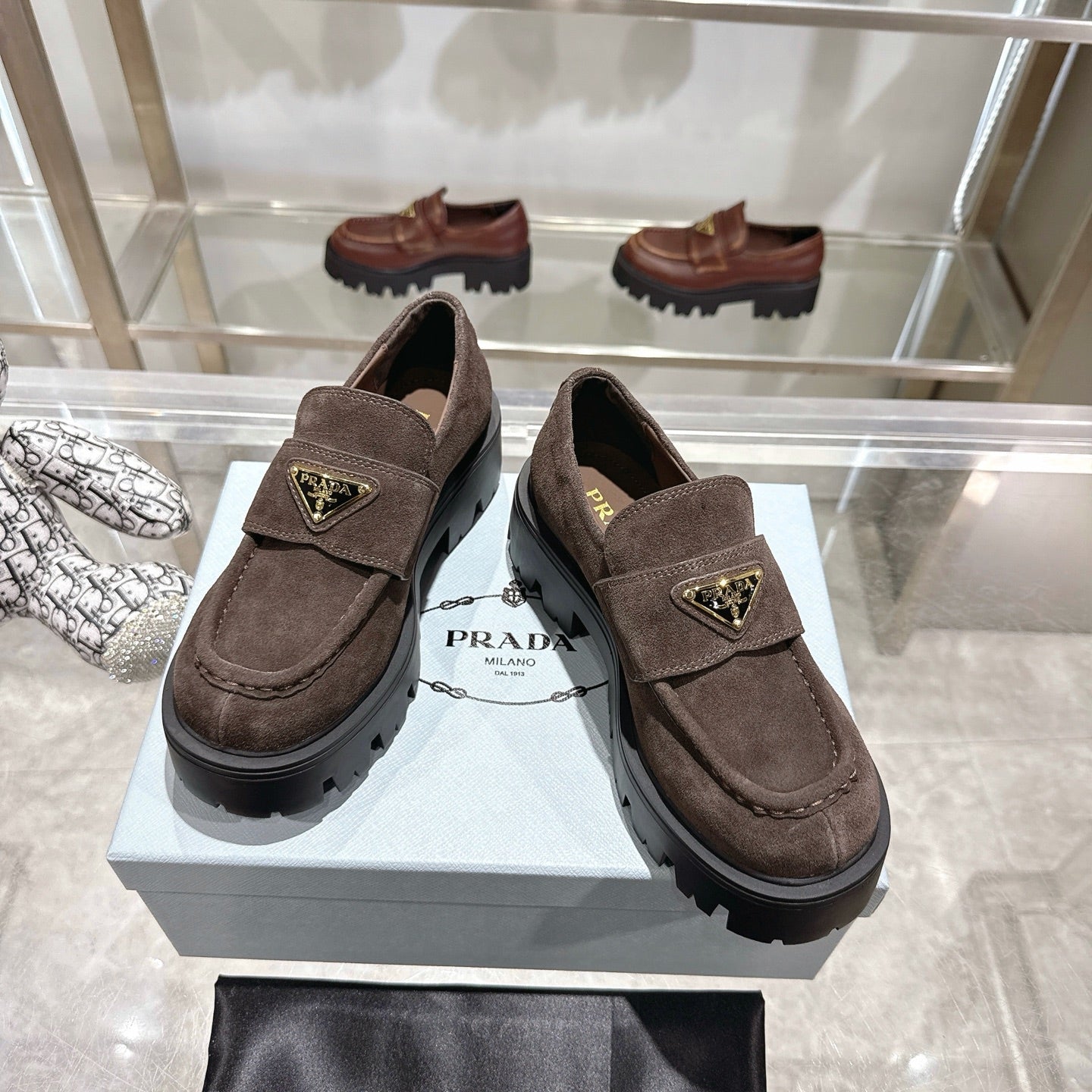 PRADA 25S THICK-SOLE LOAFERS 60 MM IN DARK BROWN SUEDE