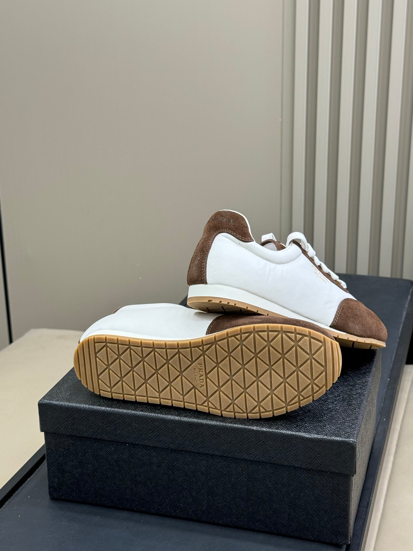 PRADA 25S SNEAKER IN WHITE MIX BROWN SUEDE STYLE 1