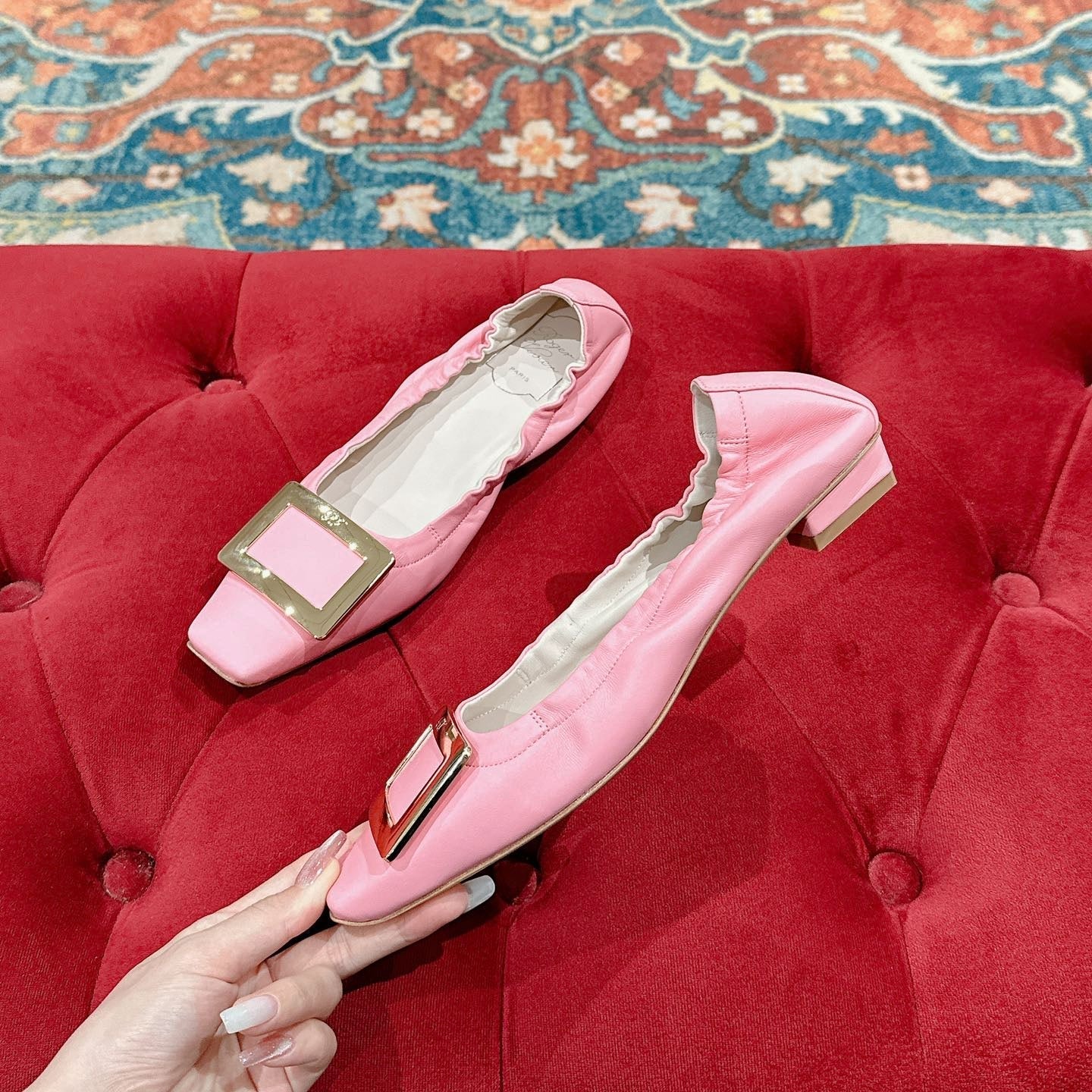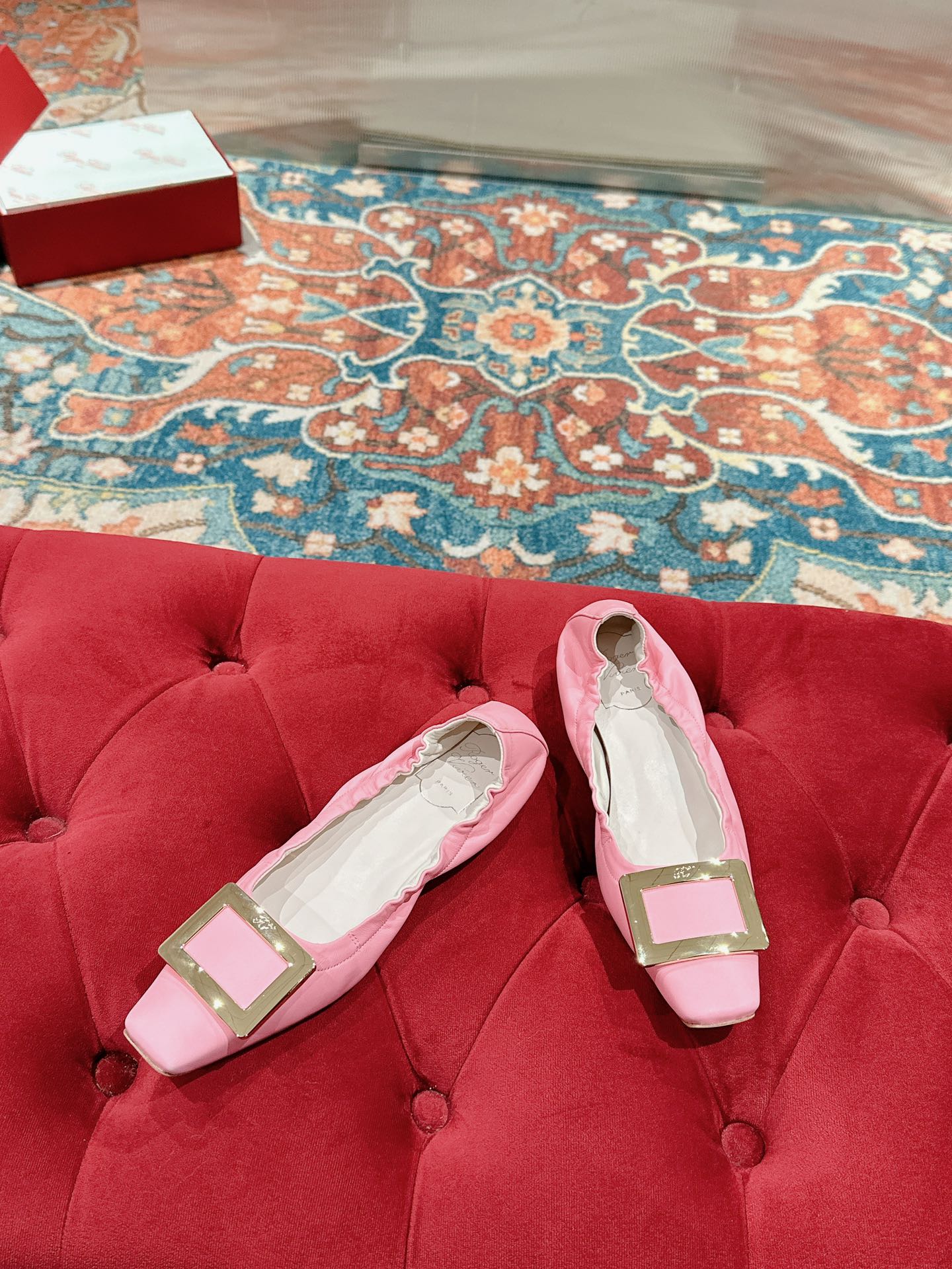 BELLE VIVIER BALLERINAS IN PINK SHINY LAMBSKIN GOLD PATENT SQUARE BUCKLE