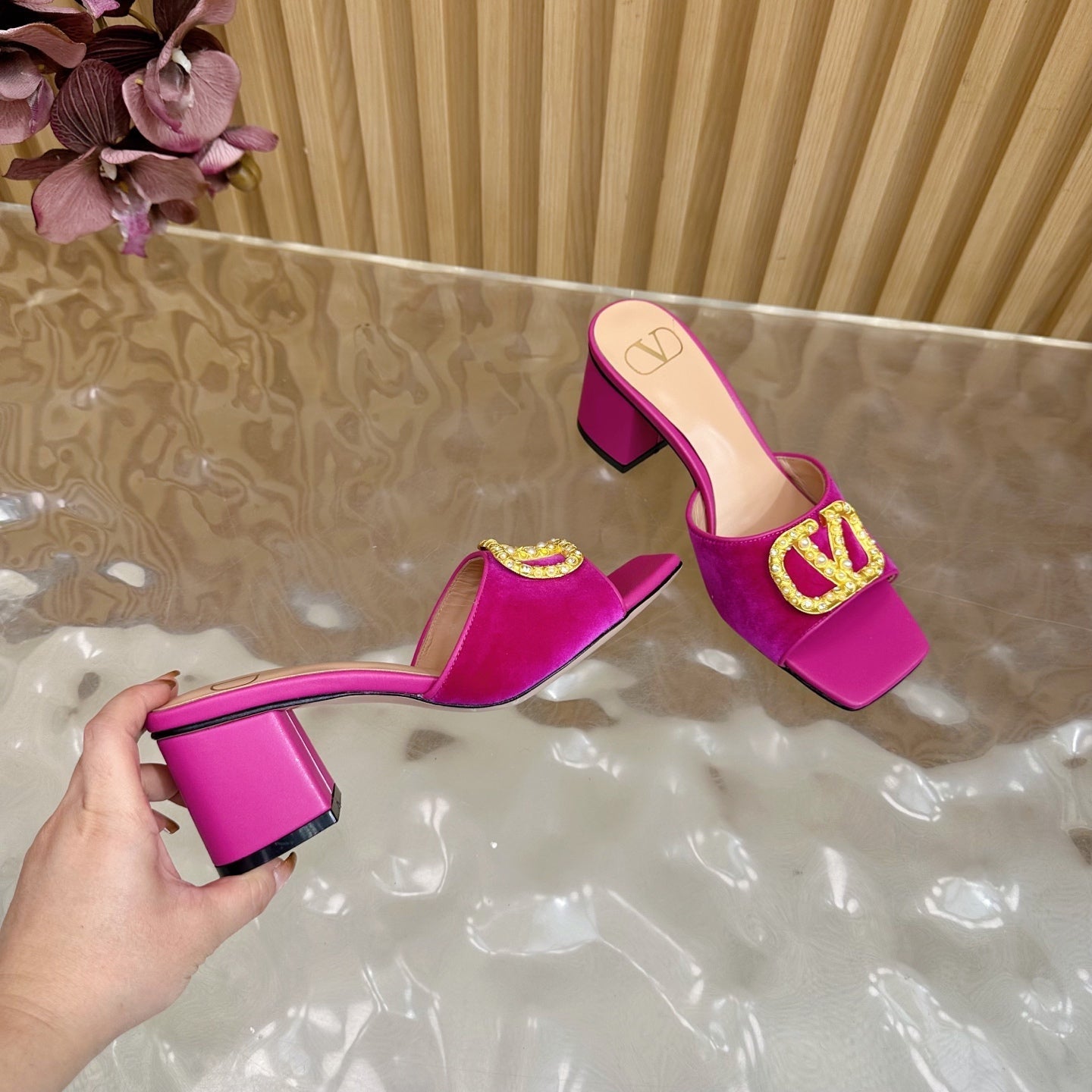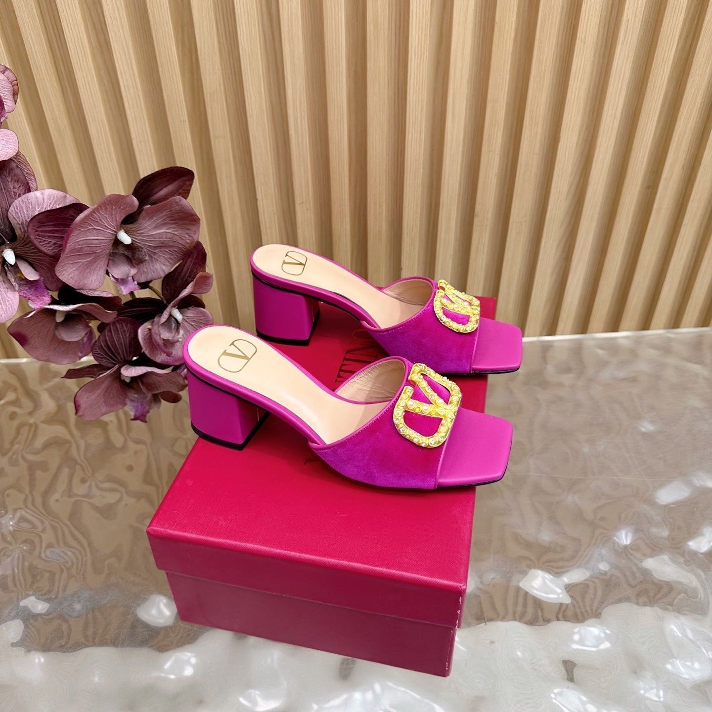 VALENTINO 25S HIGH-HEEL MULES 60 MM IN DARK PINK VELVET AND CALFSKIN WITH GOLD HARDWARE