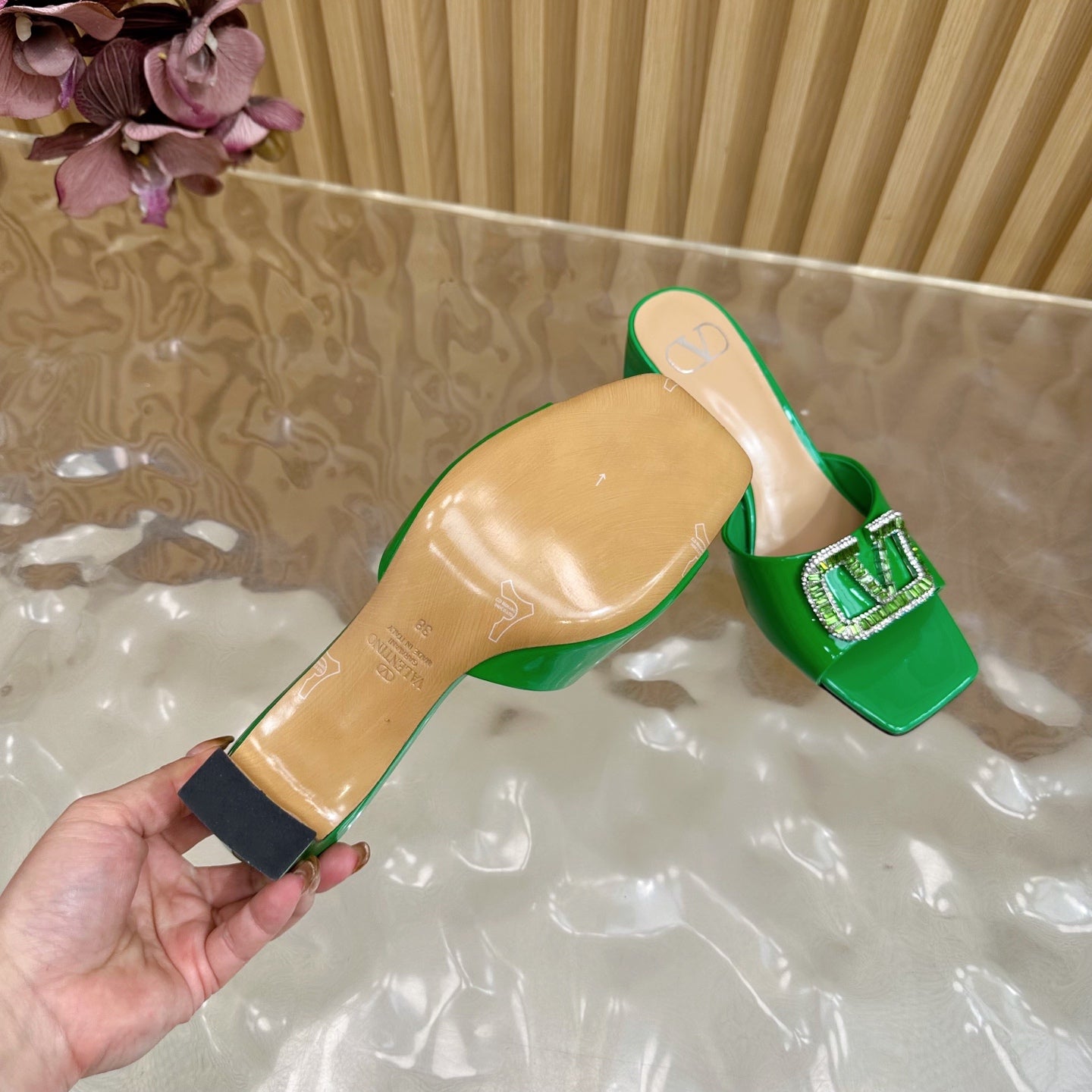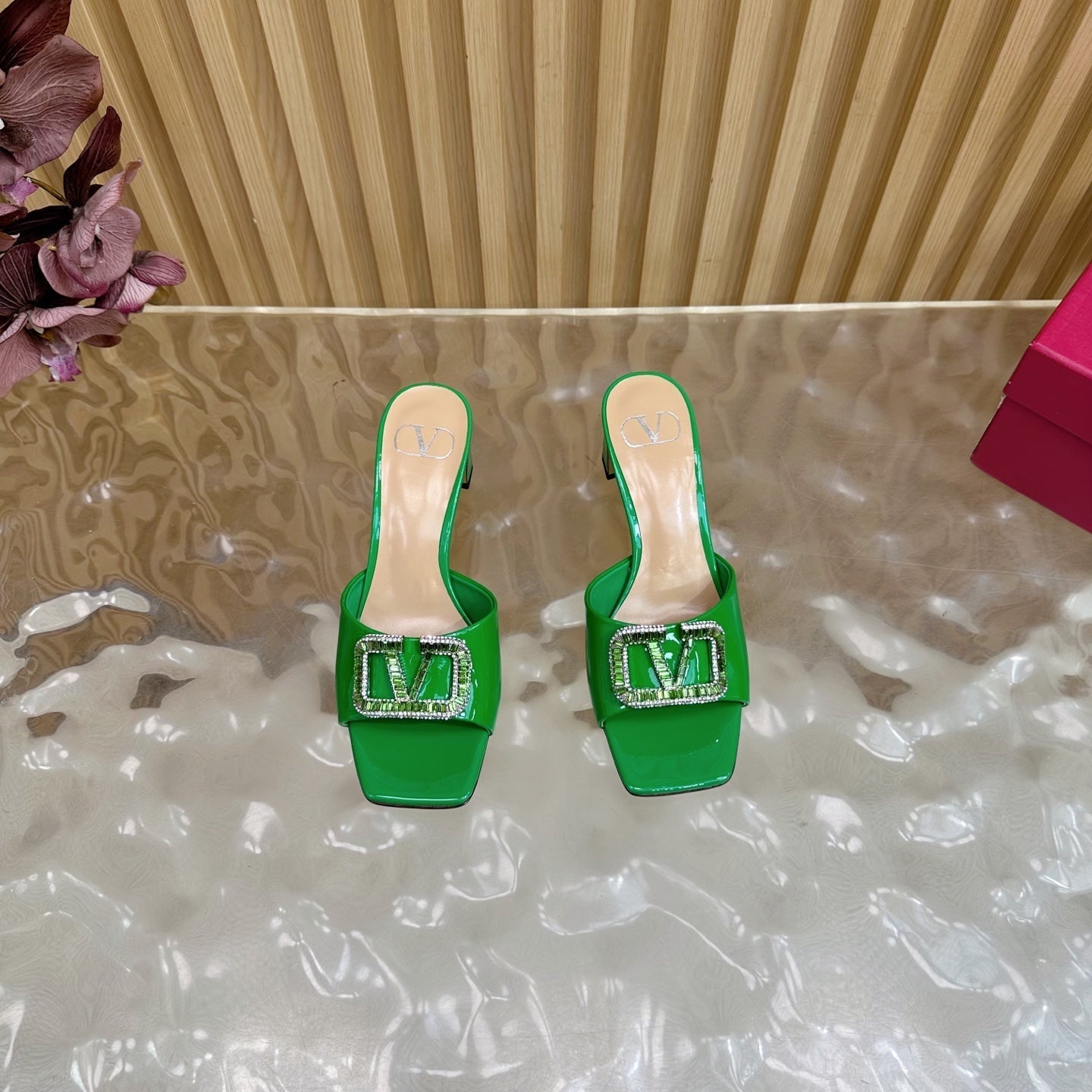 VALENTINO 25S HIGH-HEEL MULES 60 MM IN GREEN PATENT CALFSKIN WITH CRYSTAL-EMBELLISHED STRAP