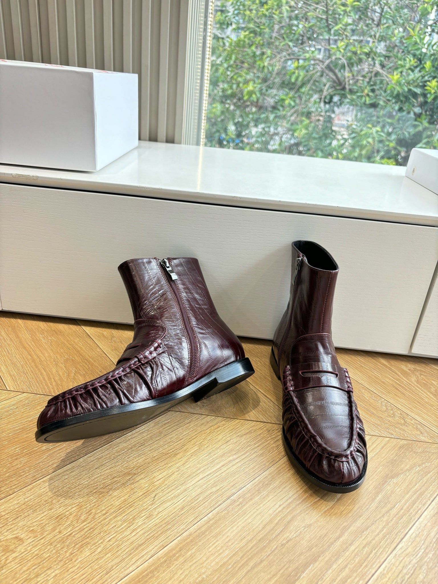 YSL 25S ANKLE FLAT BOOTS IN DEEP REDWOOD EMBOSSED LAMBSKIN WITH SIDE ZIPPER