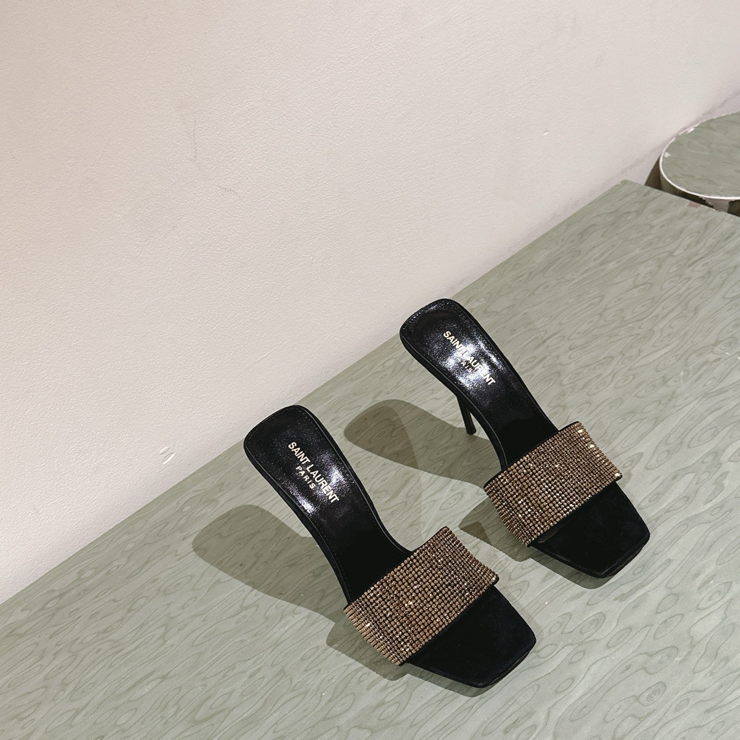 YSL 25S HEELED SANDALS 100 MM IN BLACK LAMBSKIN WITH GOLD RHINESTONE-EMBELLISHED STRAP