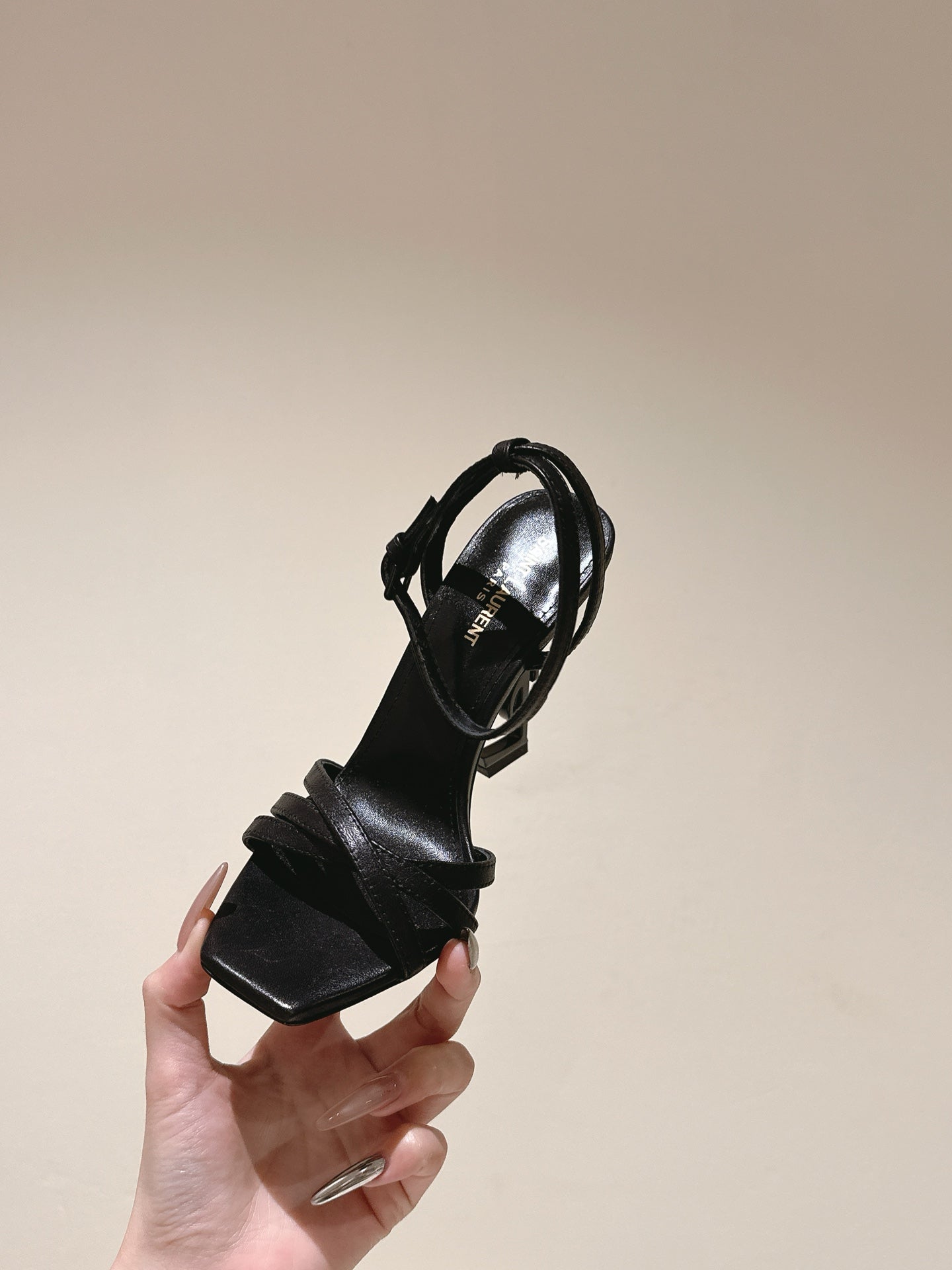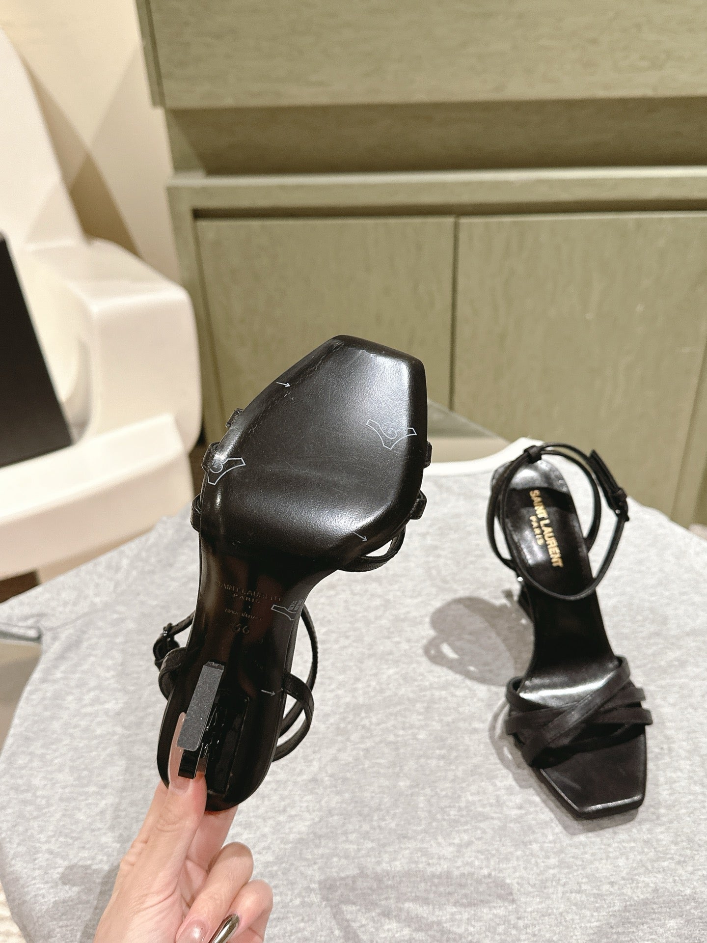 YSL 25S HIGH-HEEL SANDALS 100 MM IN BLACK LAMBSKIN WITH YSL LOGO HEEL DESIGN
