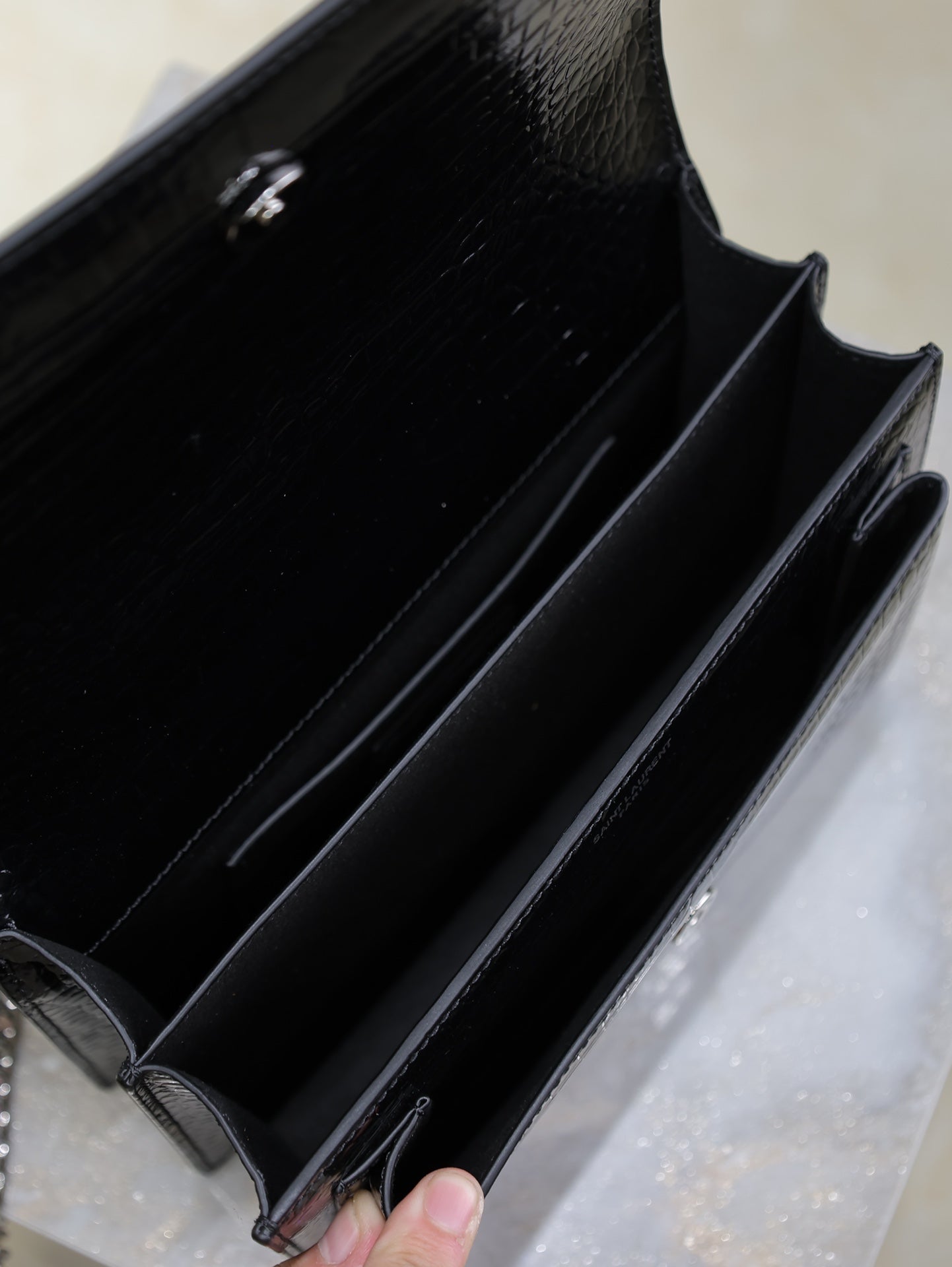 YSL 25S SUNSET MEDIUM 22 IN BLACK CROCODILE-EMBOSSED SHINY CALFSKIN SILVER HARDWRE