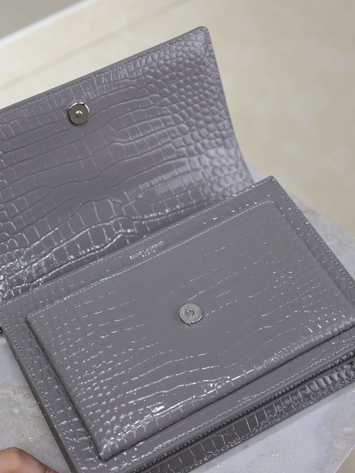 YSL 25S SUNSET MEDIUM 22 IN DARK GRAY CROCODILE-EMBOSSED SHINY CALFSKIN SILVER HARDWARE