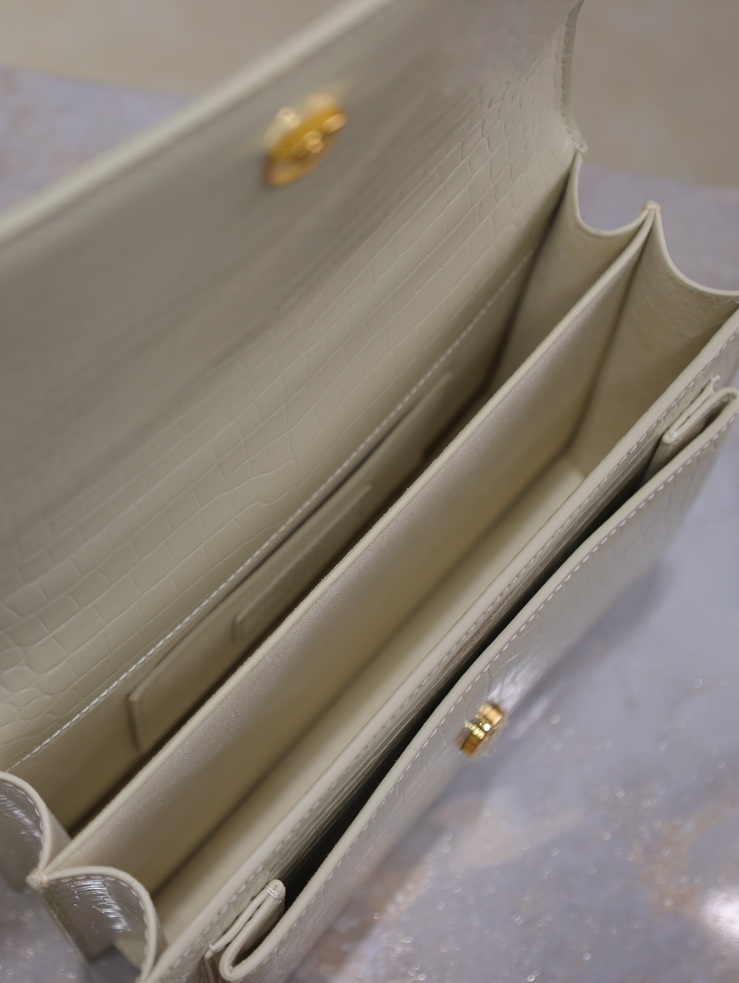 YSL 25S SUNSET MEDIUM 22 IN IVORY CROCODILE-EMBOSSED SHINY CALFSKIN GOLD HARDWARE