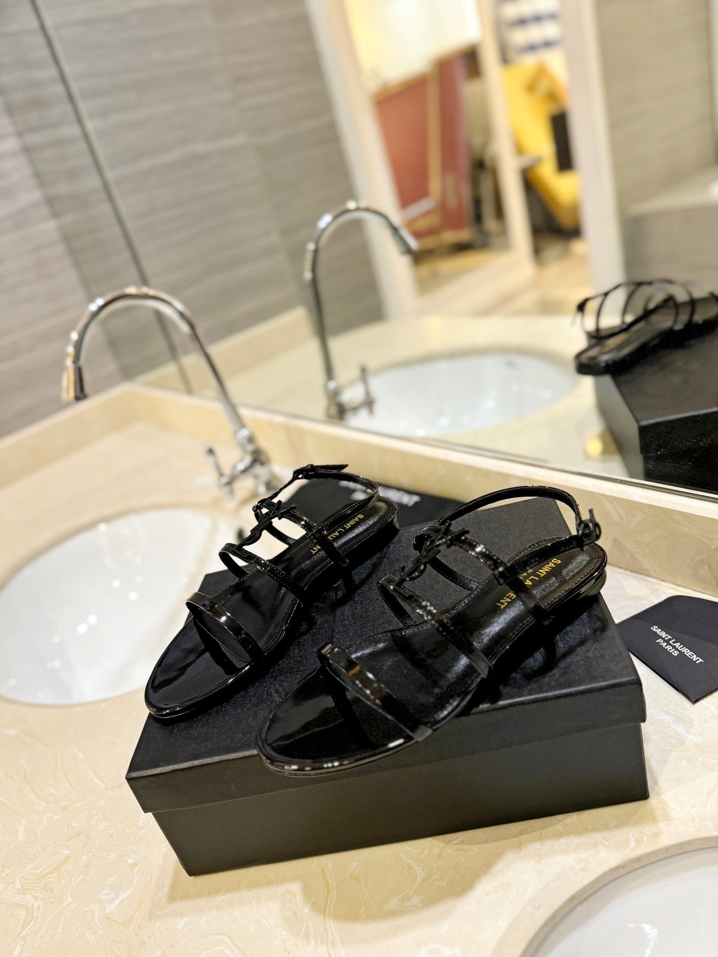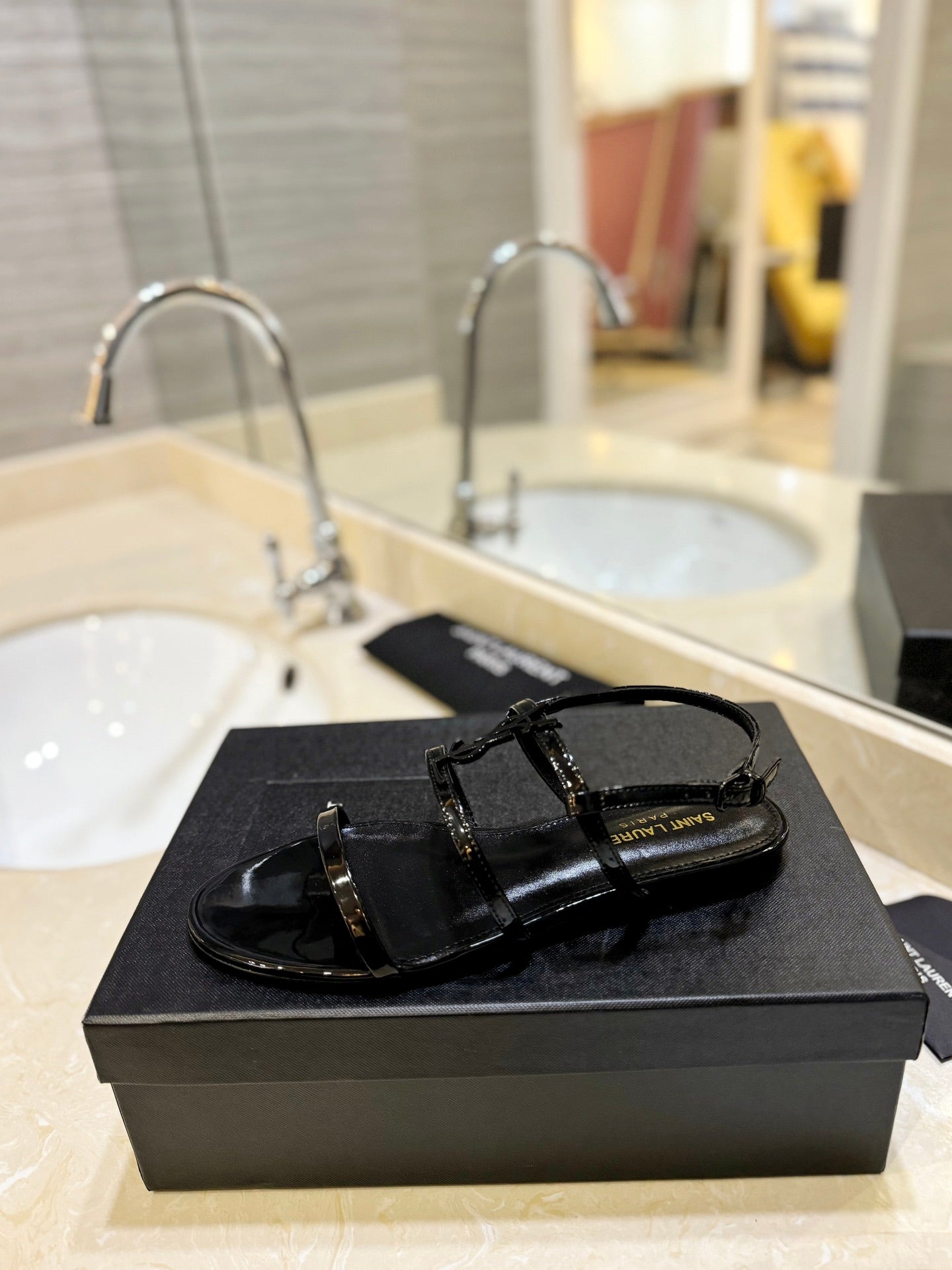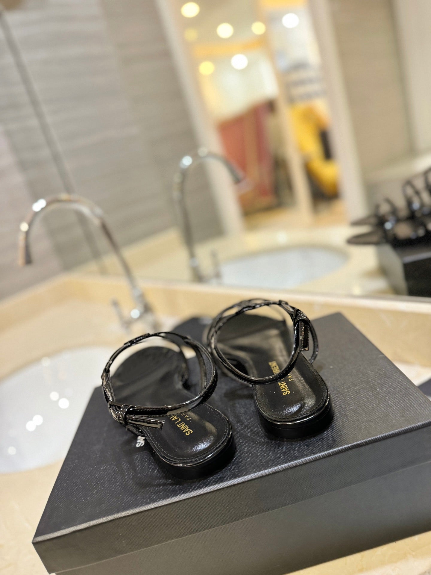 SL LOGO FLAT SANDALS BLACK POLISHED CALFSKIN