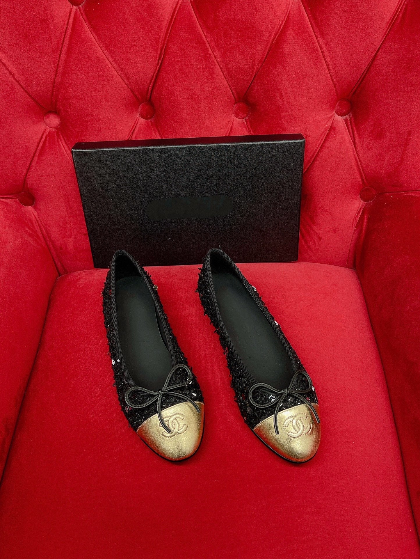 ballet flat black gold tweed metal calfskin