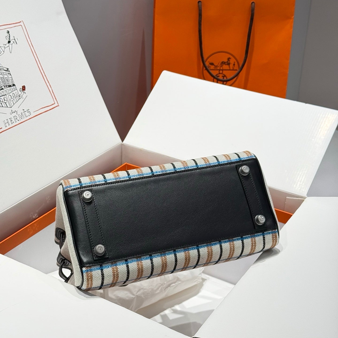 BIRKIN SHOULDER 29 IN BLACK CALFSKIN ÉCRU/NOIR/FAUVE/NOIR/BLEU ZANZIBAR EMBROIDERY PLAID CANVAS