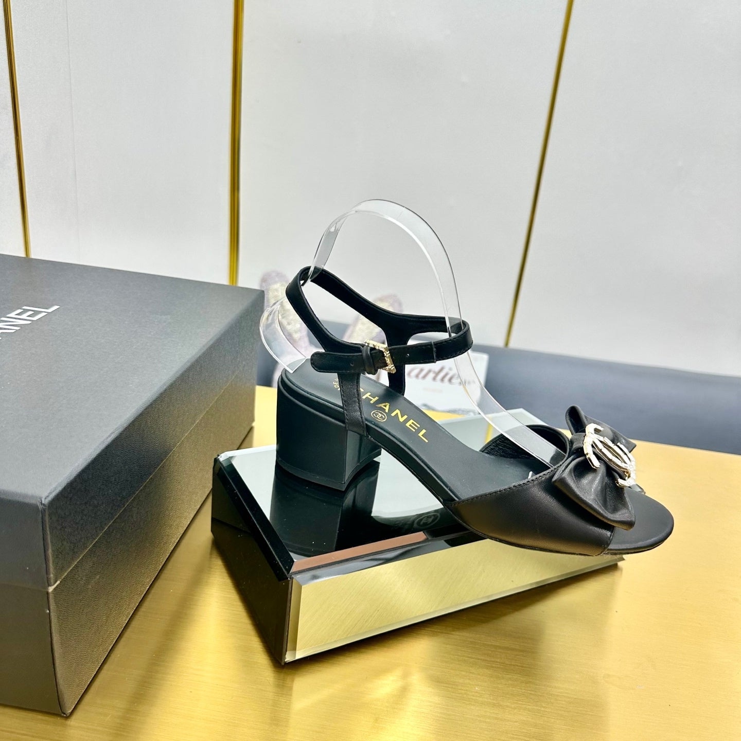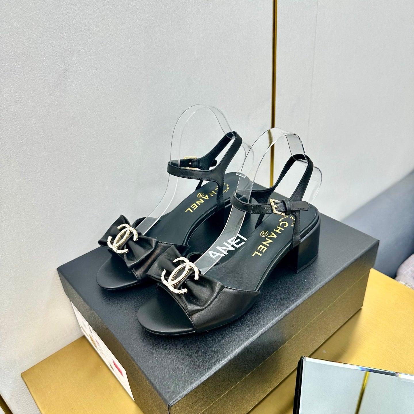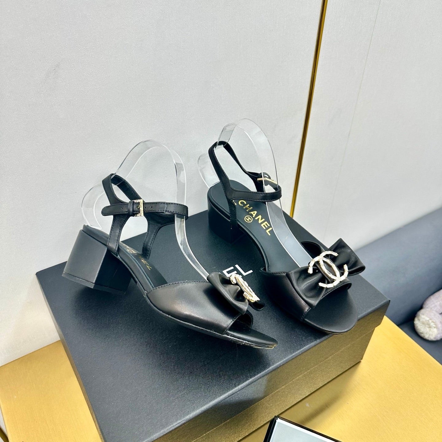 BOWKNOT RHINESTONES MID HEEL SANDAL IN BLACK CALFSKIN