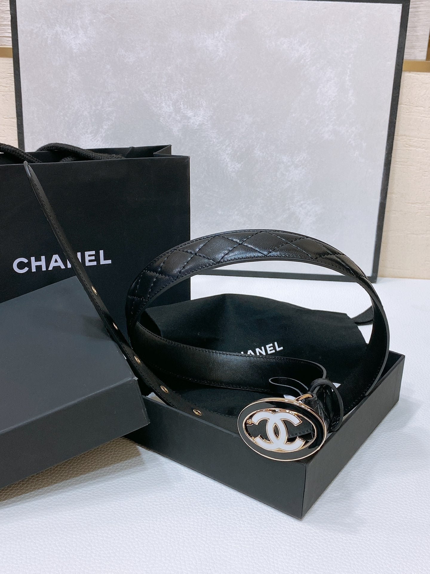 CC 30MM BELT IN BLACK EMBROIDERED CALFSKIN WHITE MIX BLACK METAL LOGO GOLD HARDWARE