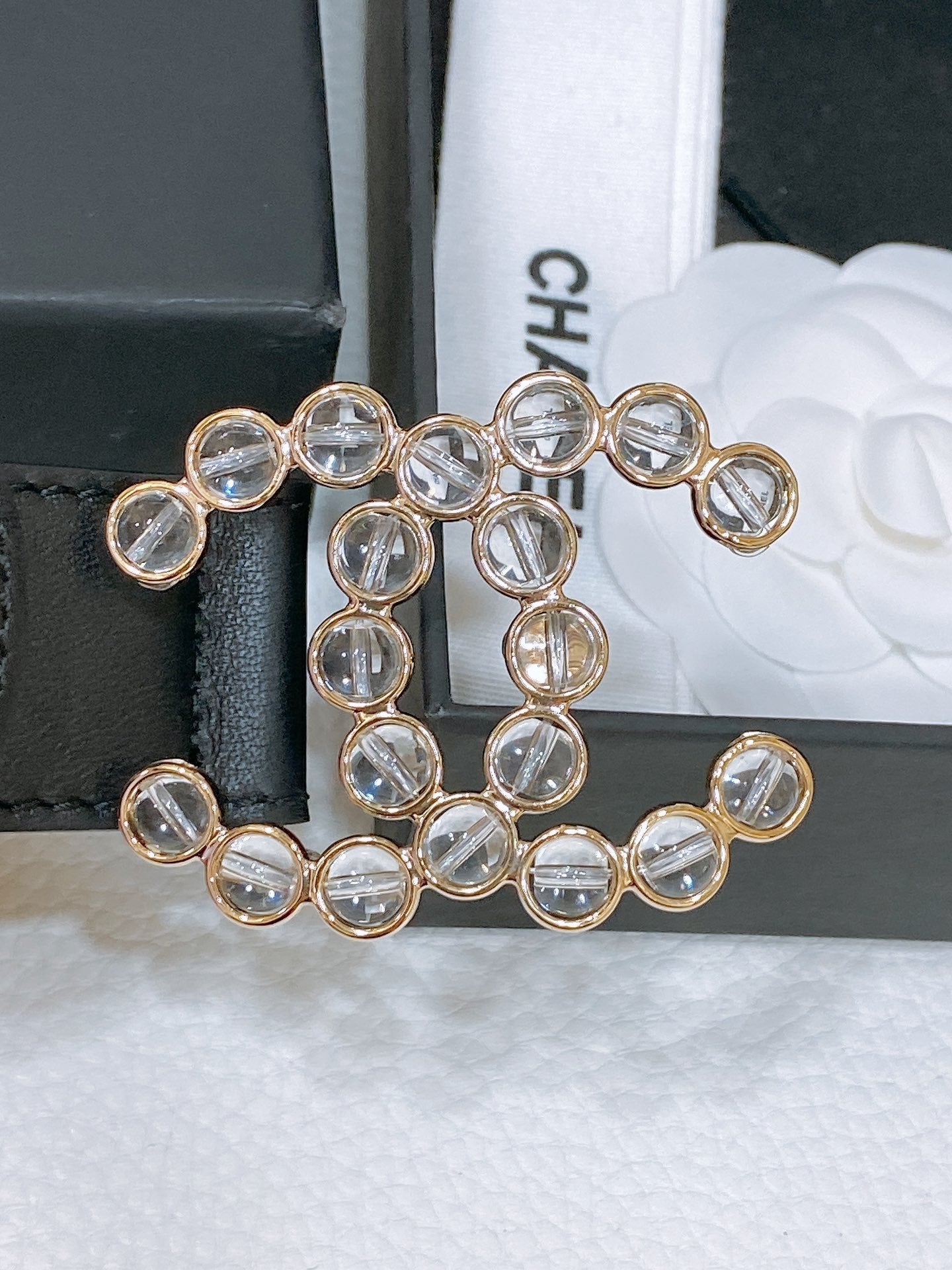 CC BELT 30 MM IN BLACK CALFSKIN PEARL LOGO WITH GOLD HARDWARE