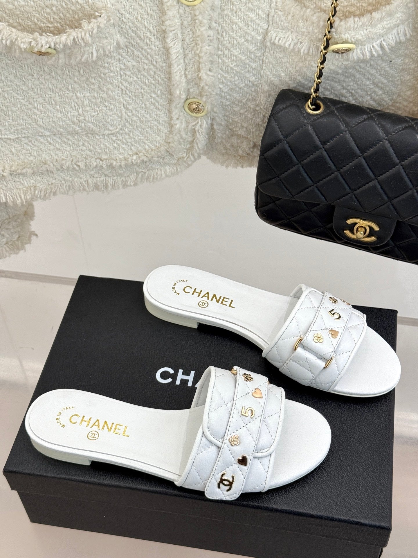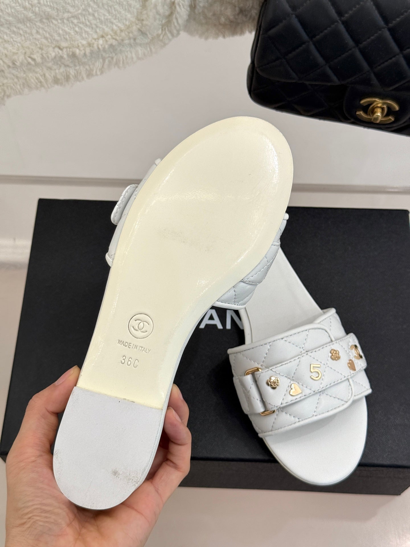 CC SLIDE SANDALS IN WHITE CALFSKIN GOLD CHARM