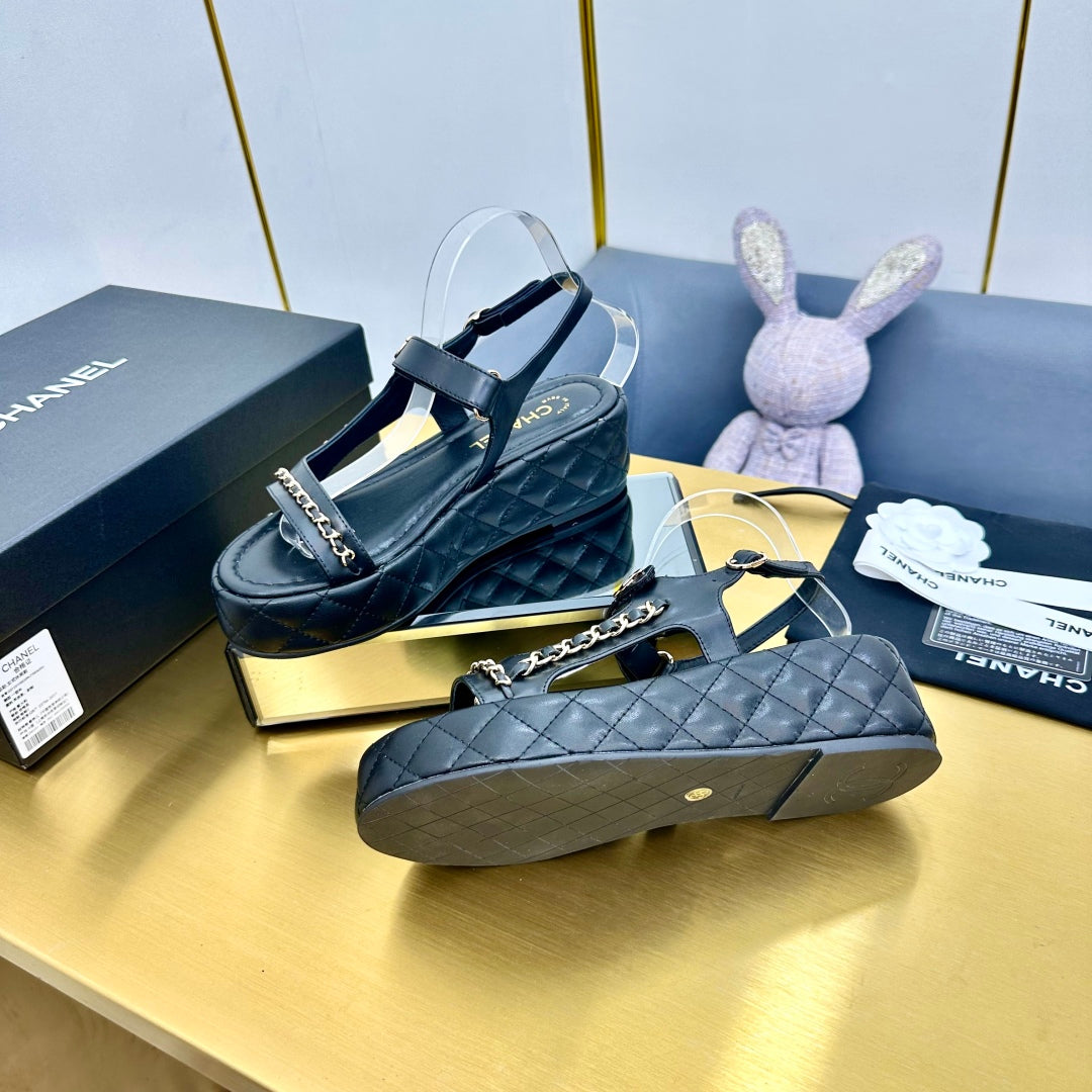 CC WEDGE SANDALS 25S IN BLACK CALFSKIN WITH GOLD HARDWARE