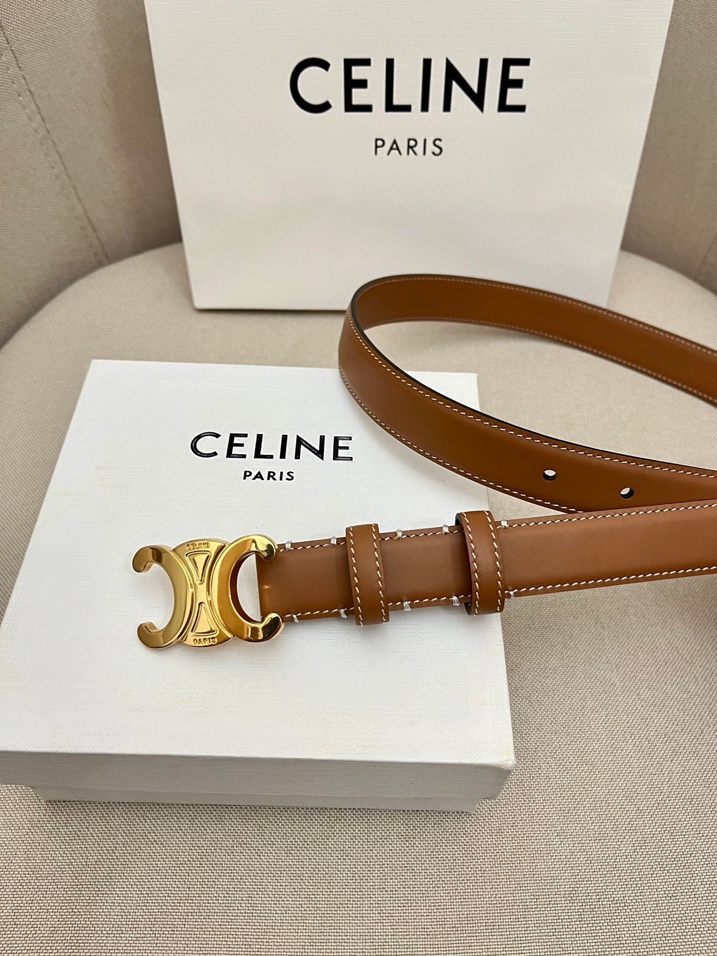 CELINE 25S TRIOMPHE 25MM BELT IN CARAMEL CALFSKIN GLOD HARDWARE