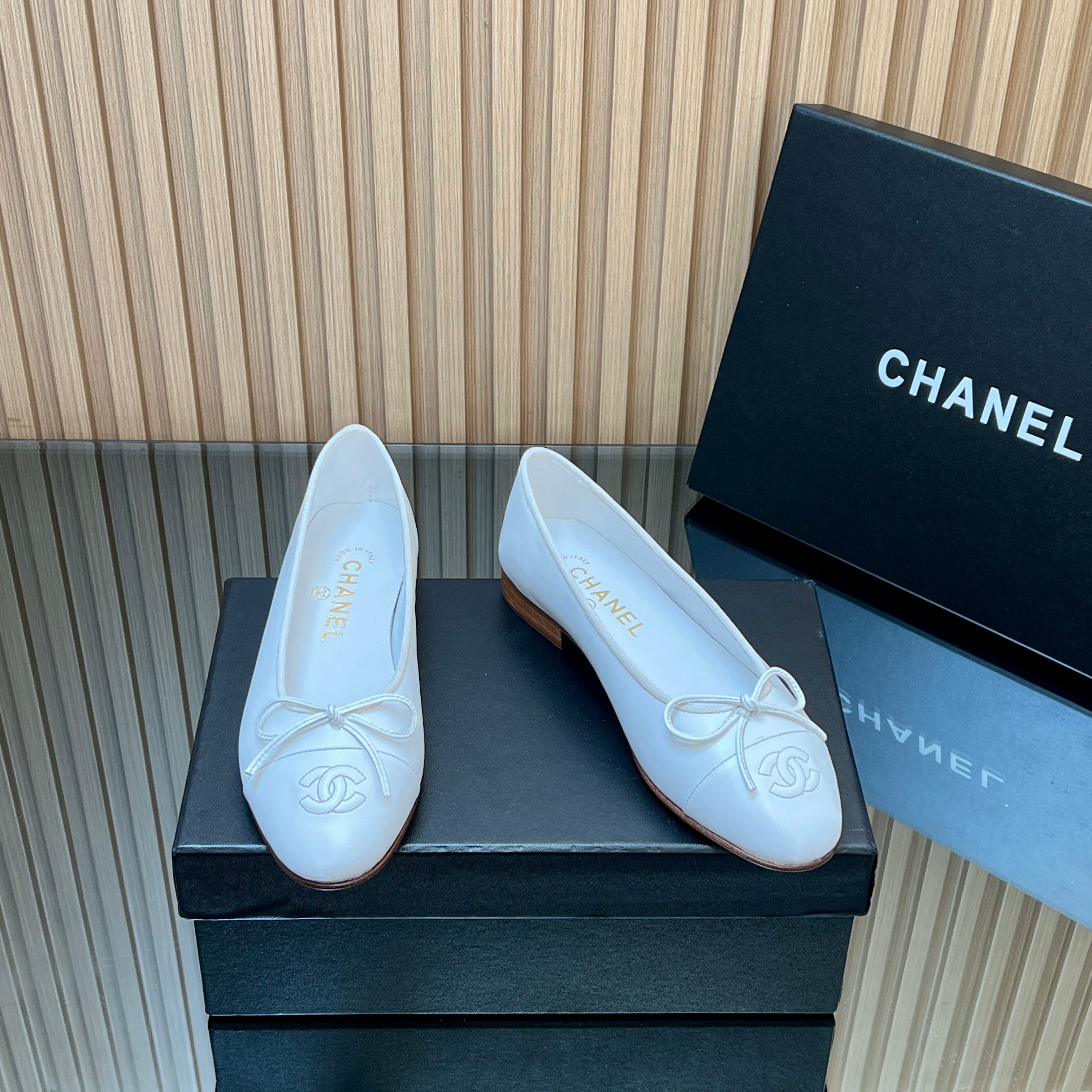 CHANEL 25S BALLET FLATS 20MM IN WHITE CALFSKIN WITH BOW