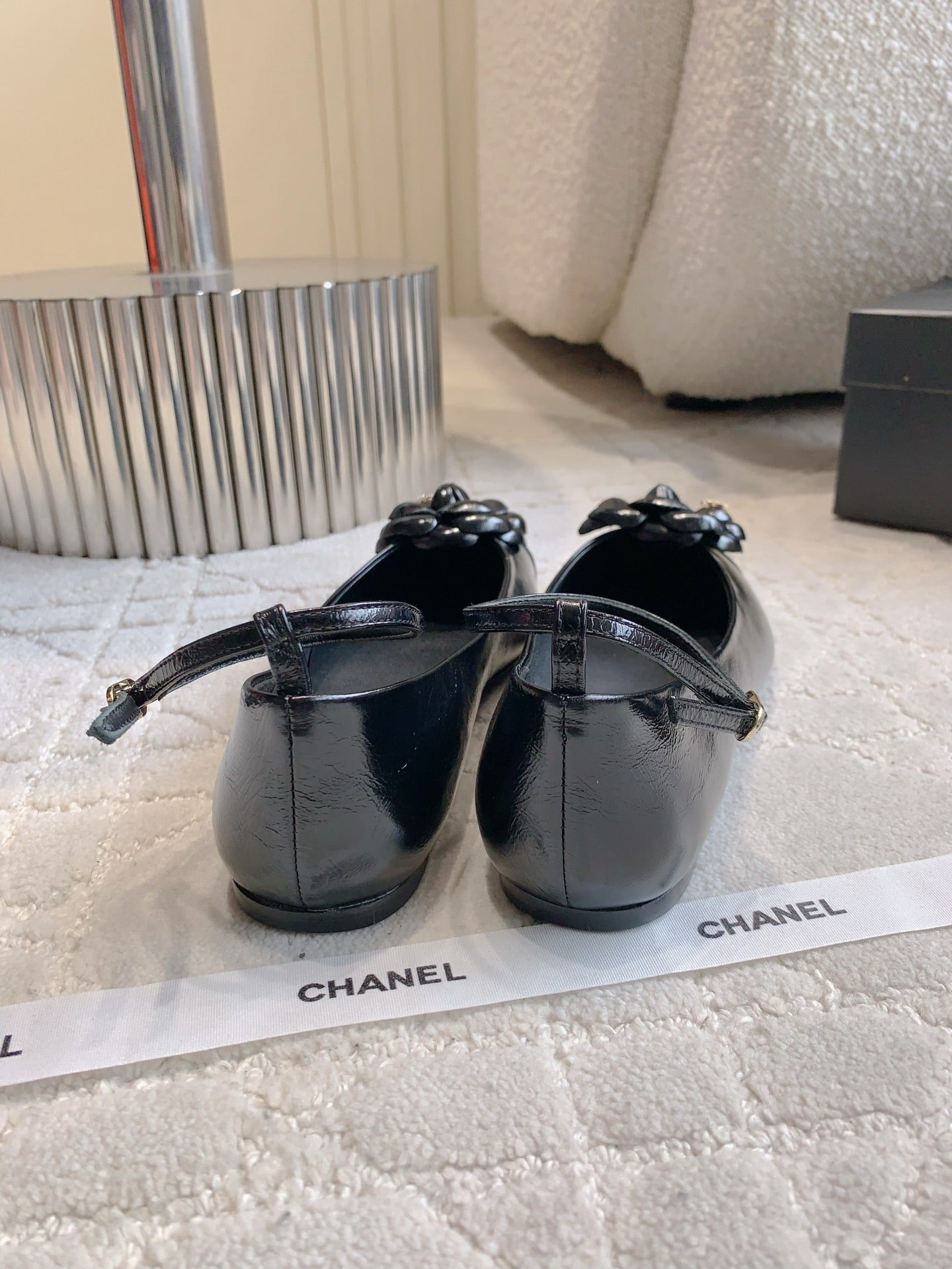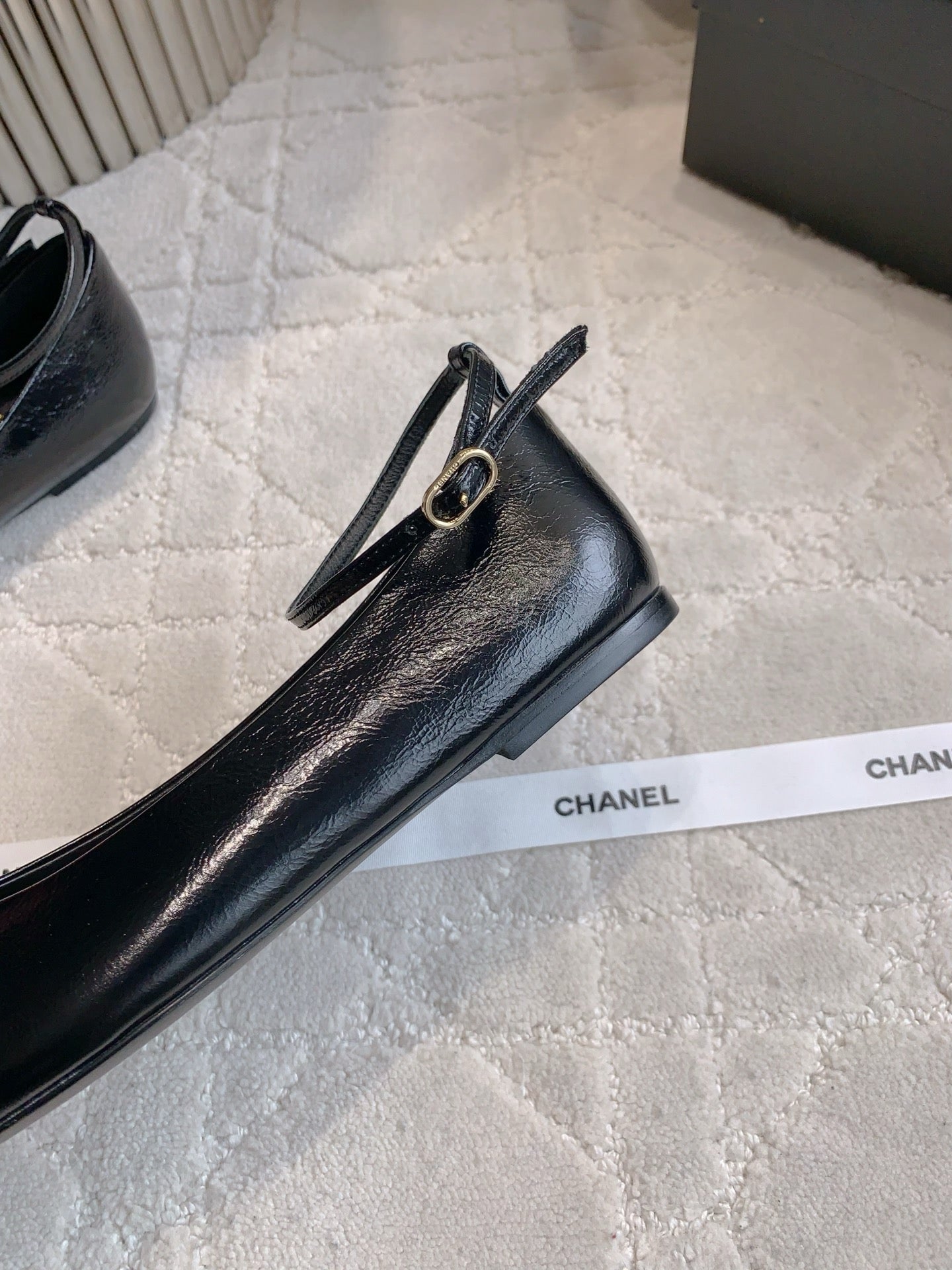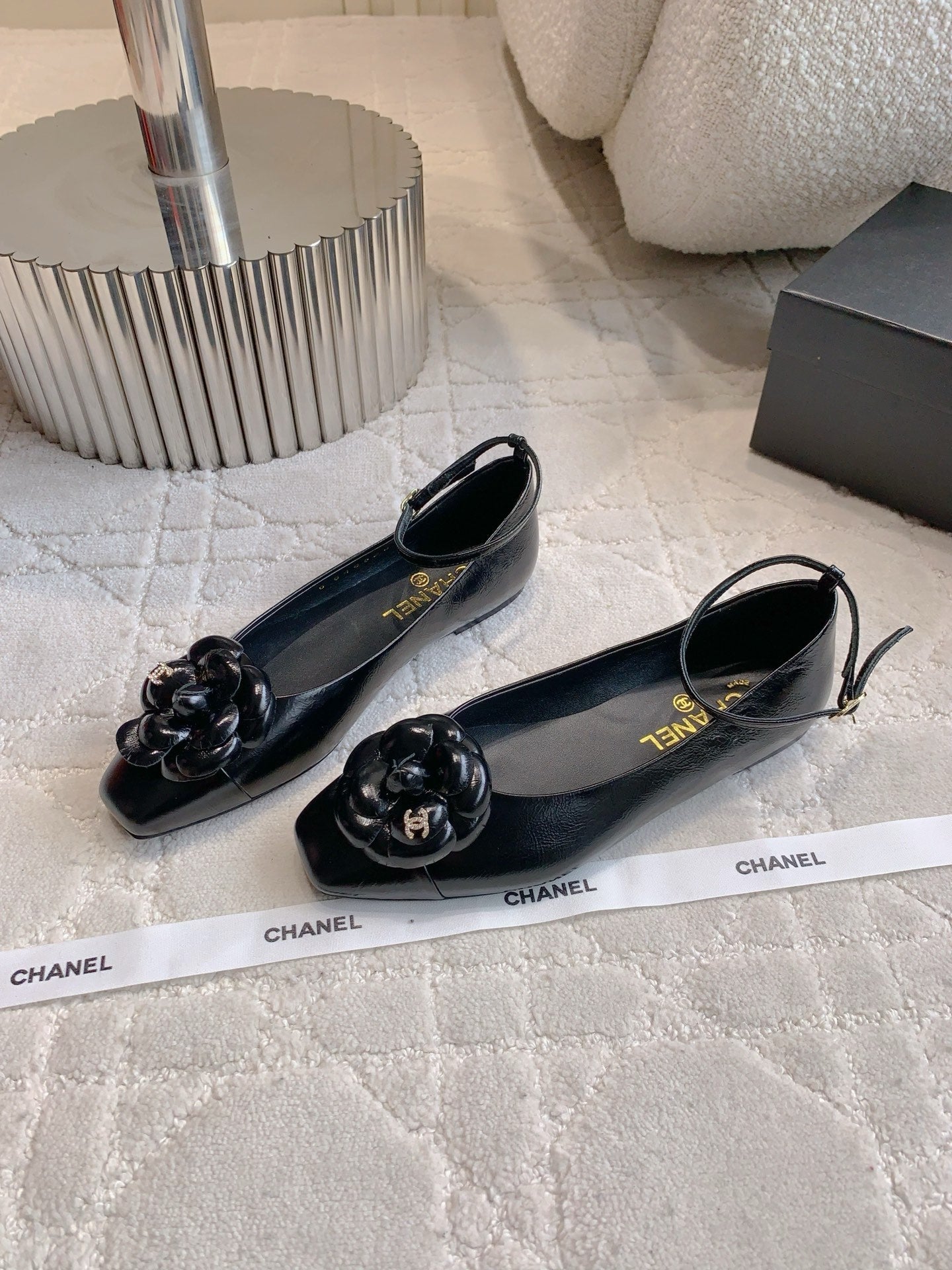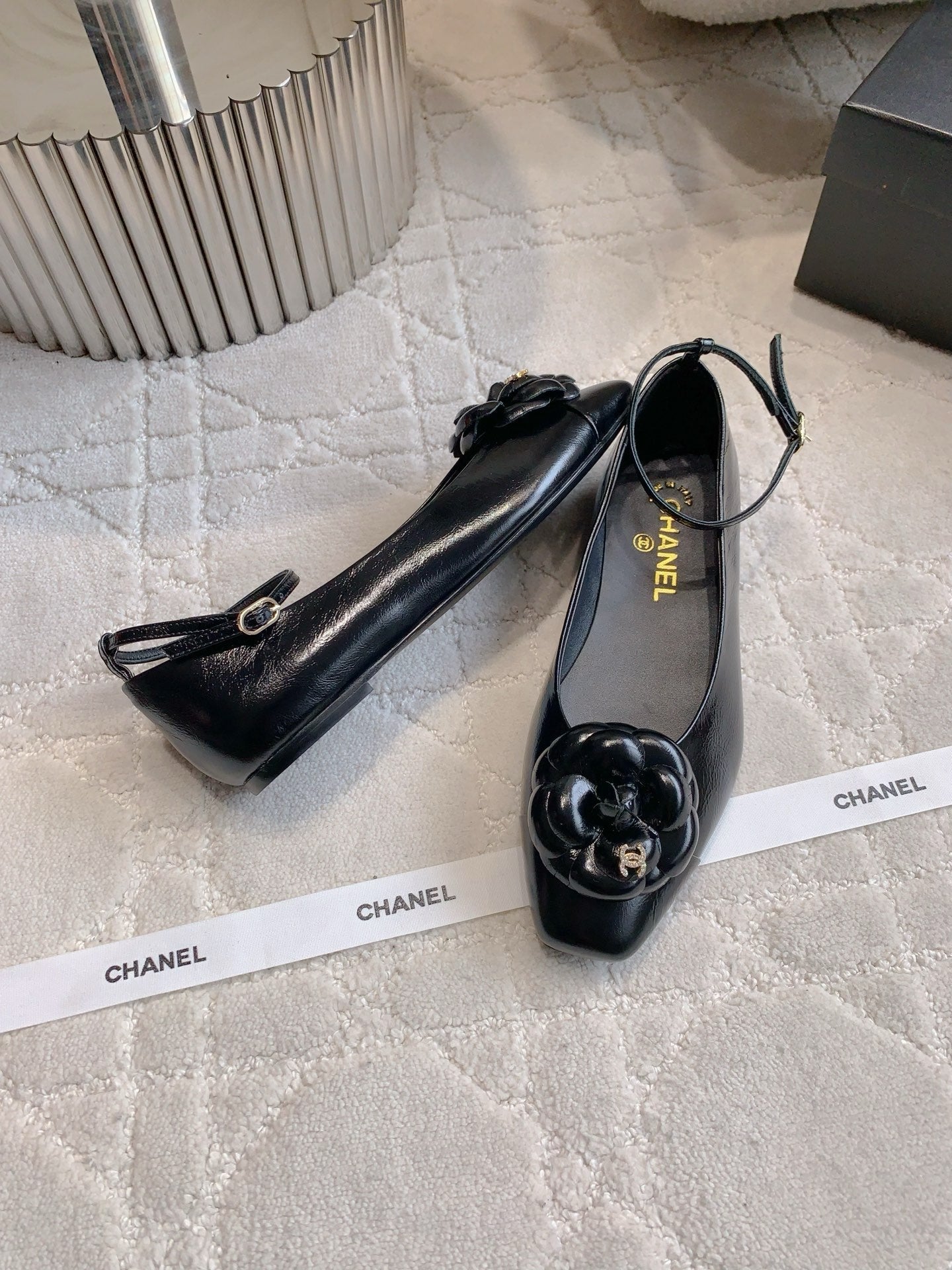 CHANEL 25S CAMELLIA SQUARE TOE FLATS IN BLACK CALFSKIN GOLD HARDWARE