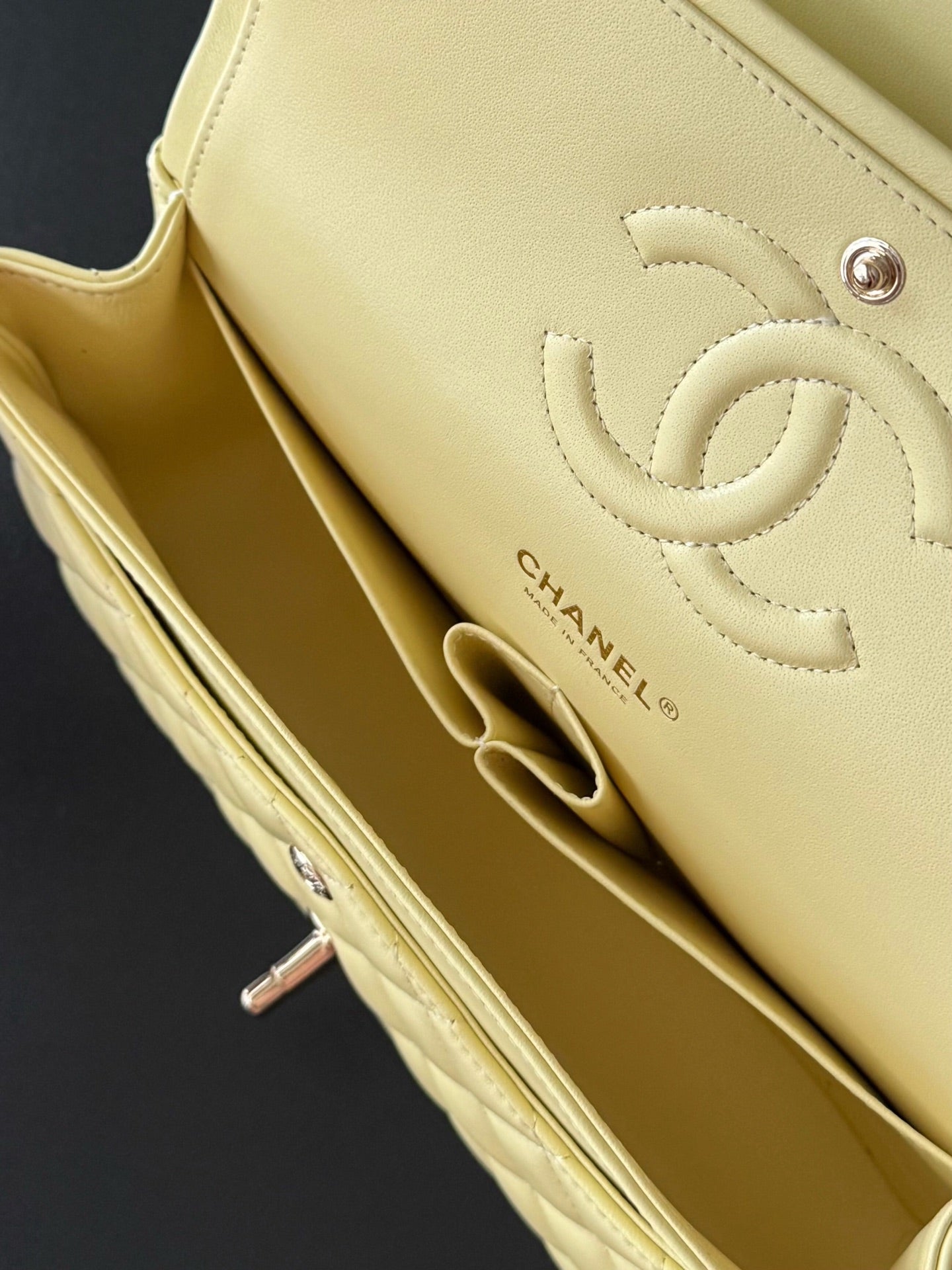 CHANEL 25S CLASSIC FLAP BAG 25 CM IN PALE BEIGE YELLOW LAMBSKIN WITH GOLD HARDWARE