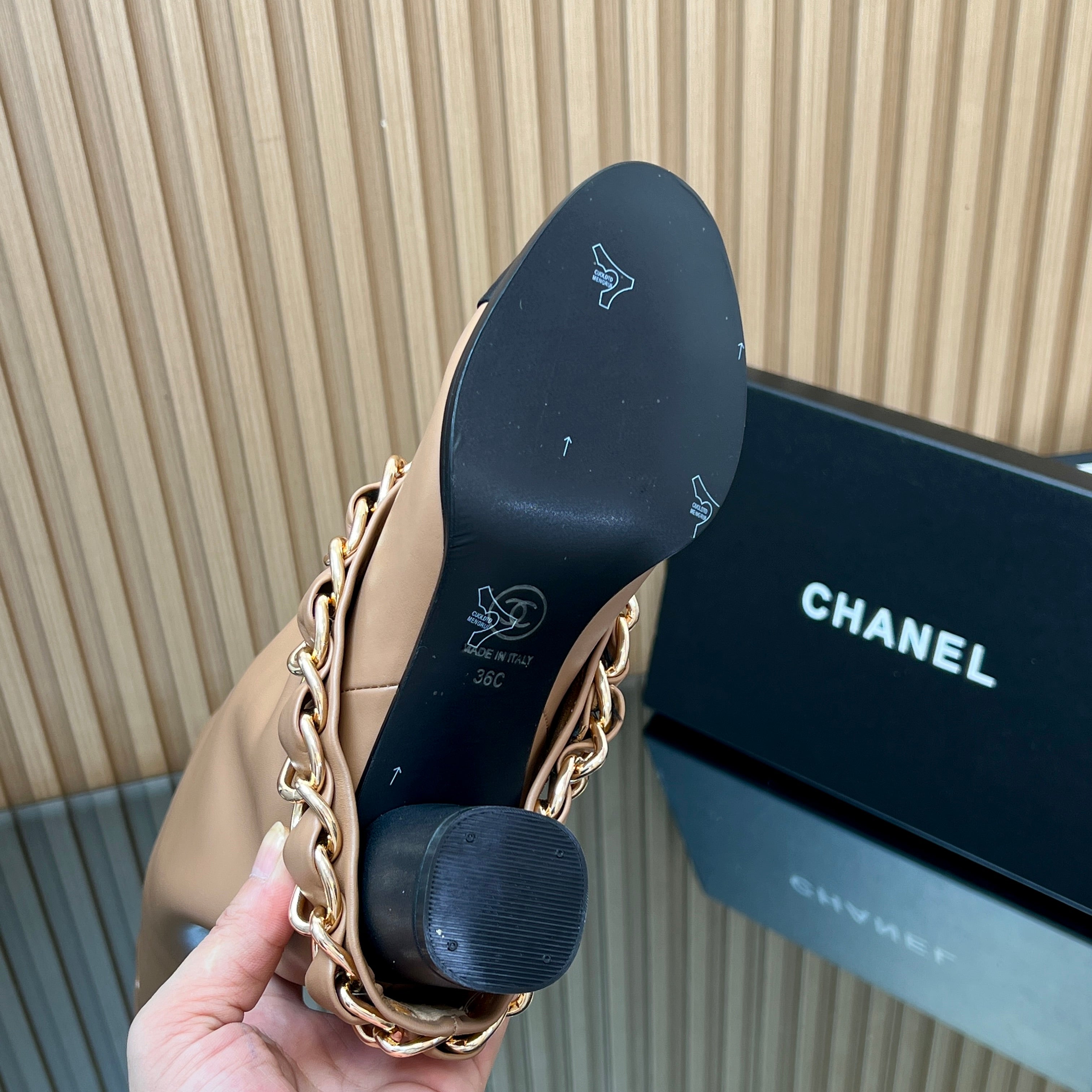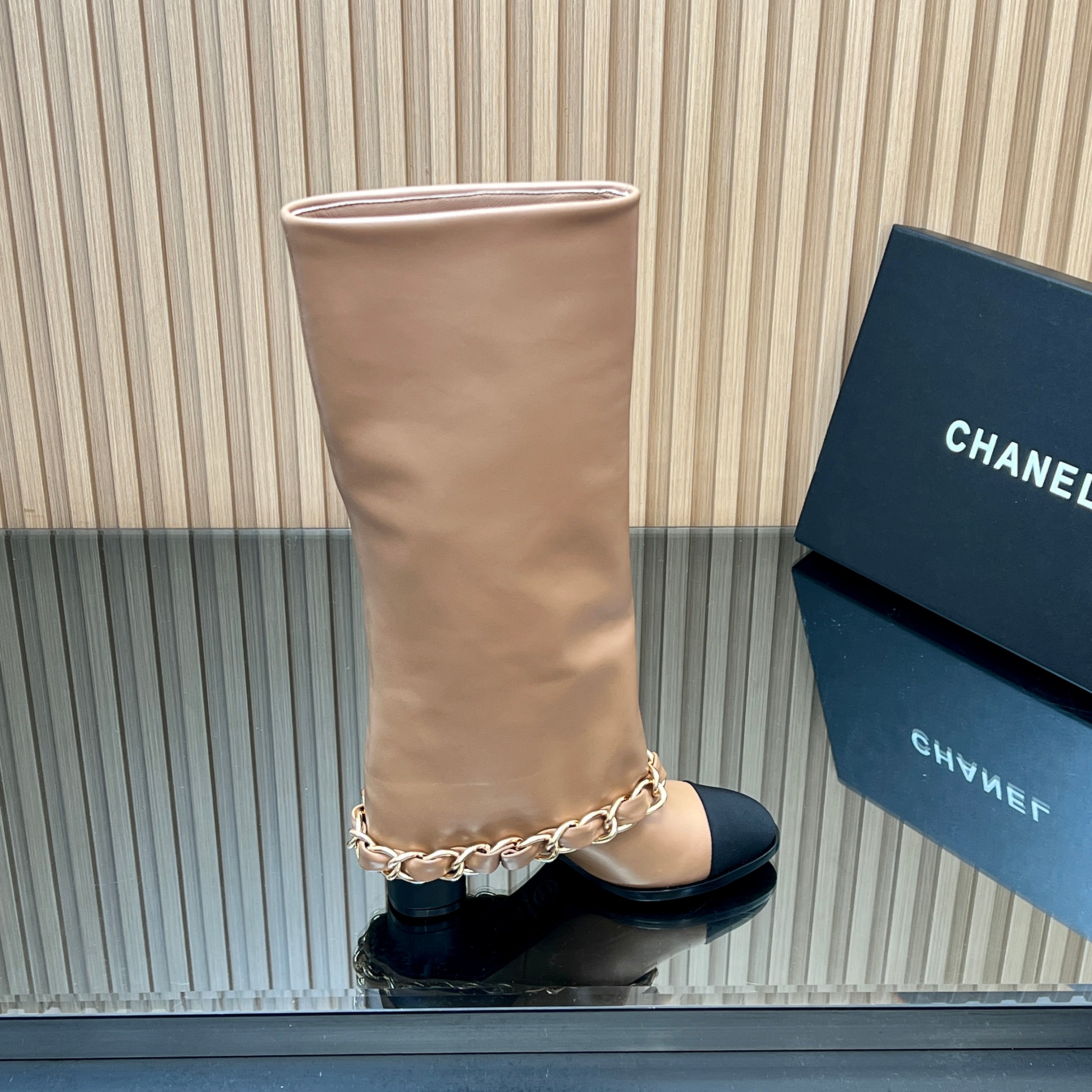 CHANEL 25S KNEE-HIGH HEELED BOOTS 65MM IN BEIGE CALFSKIN GOLD HARDWRE