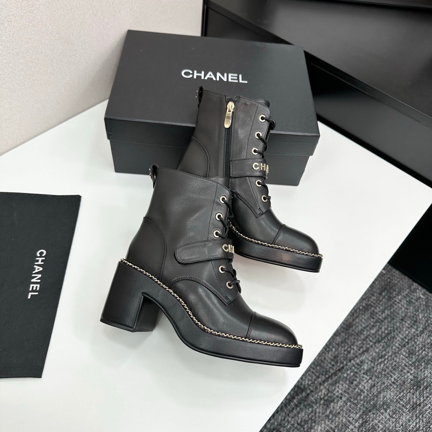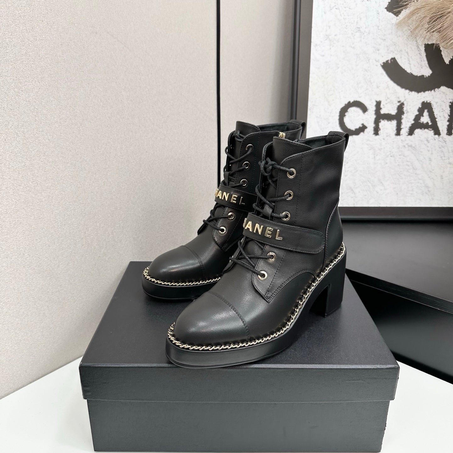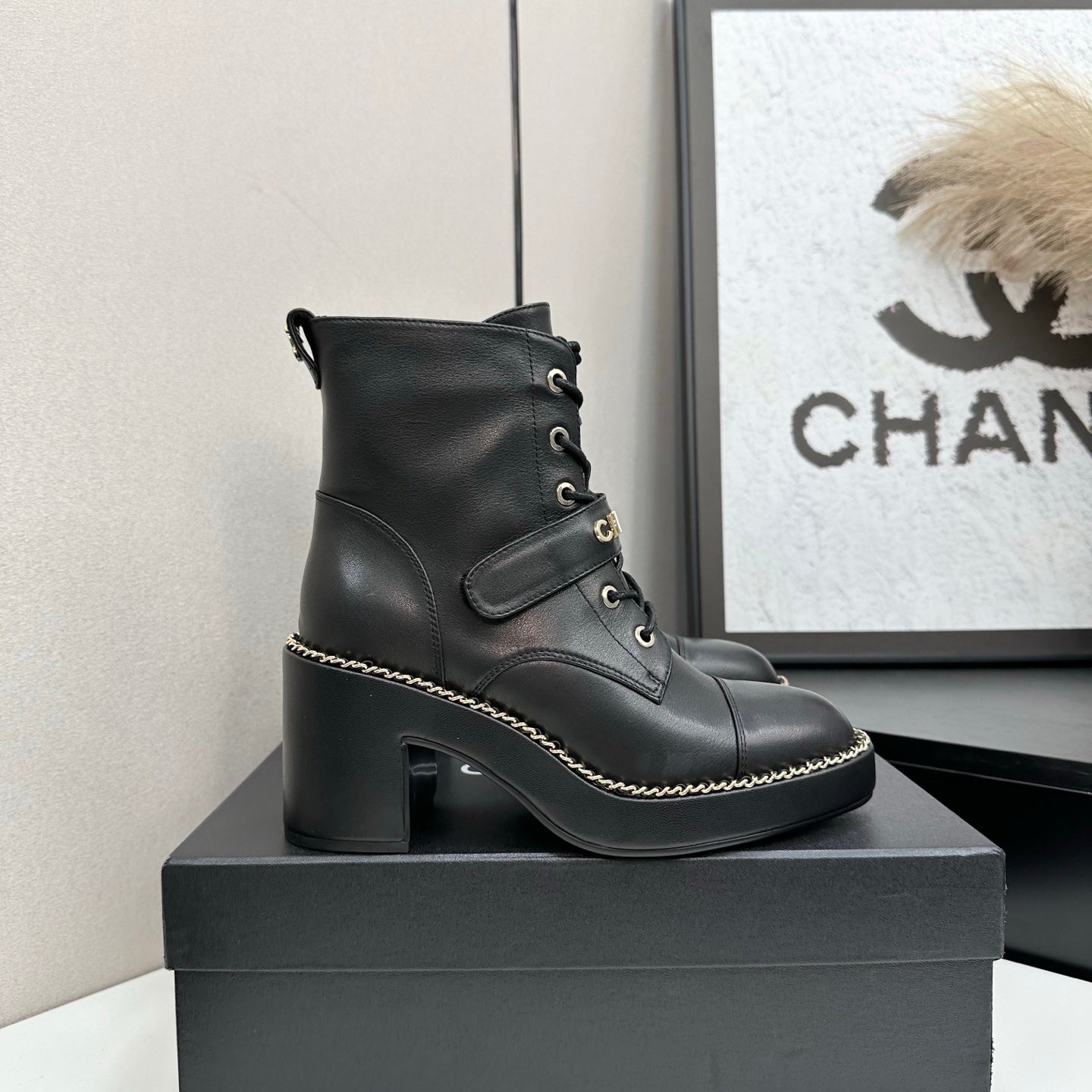 CHANEL 25S LACE-UP HEELED ANKLE BOOTS IN BLACK CALFSKIN
