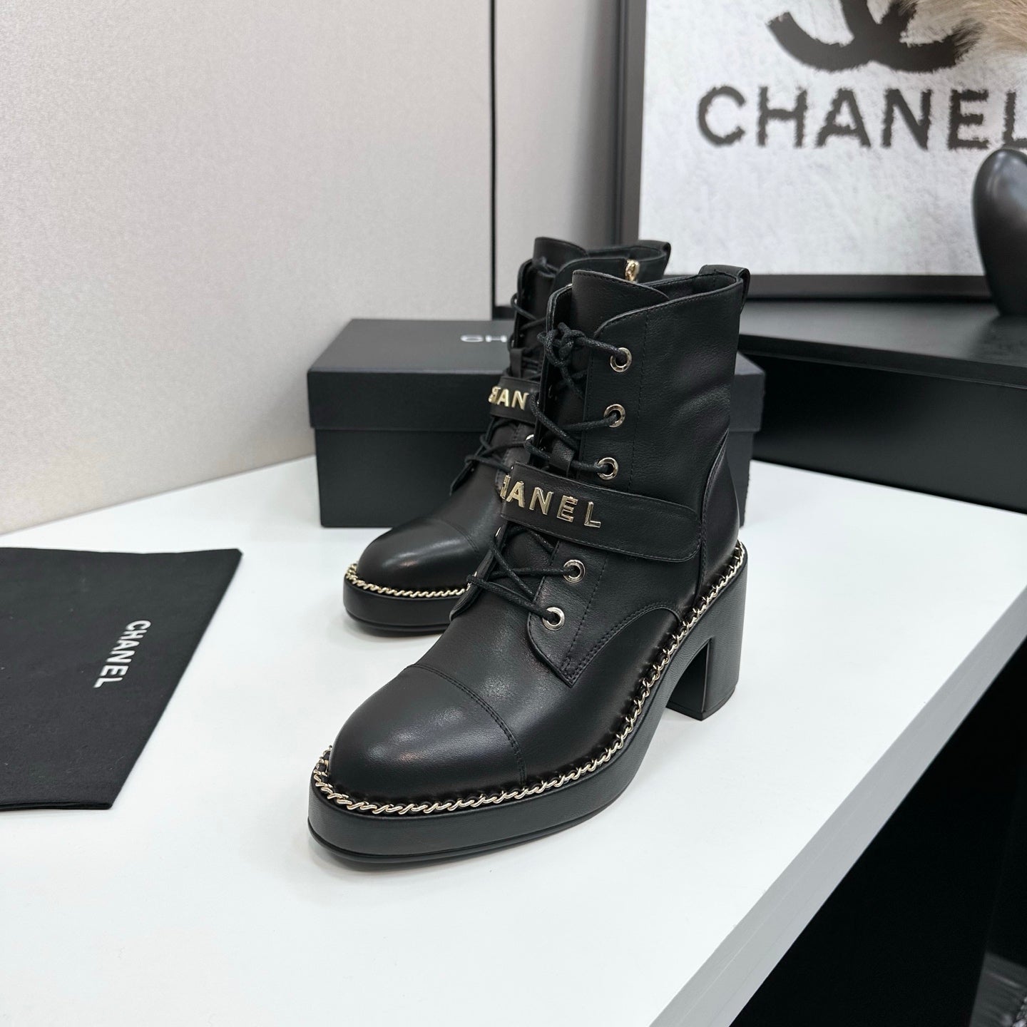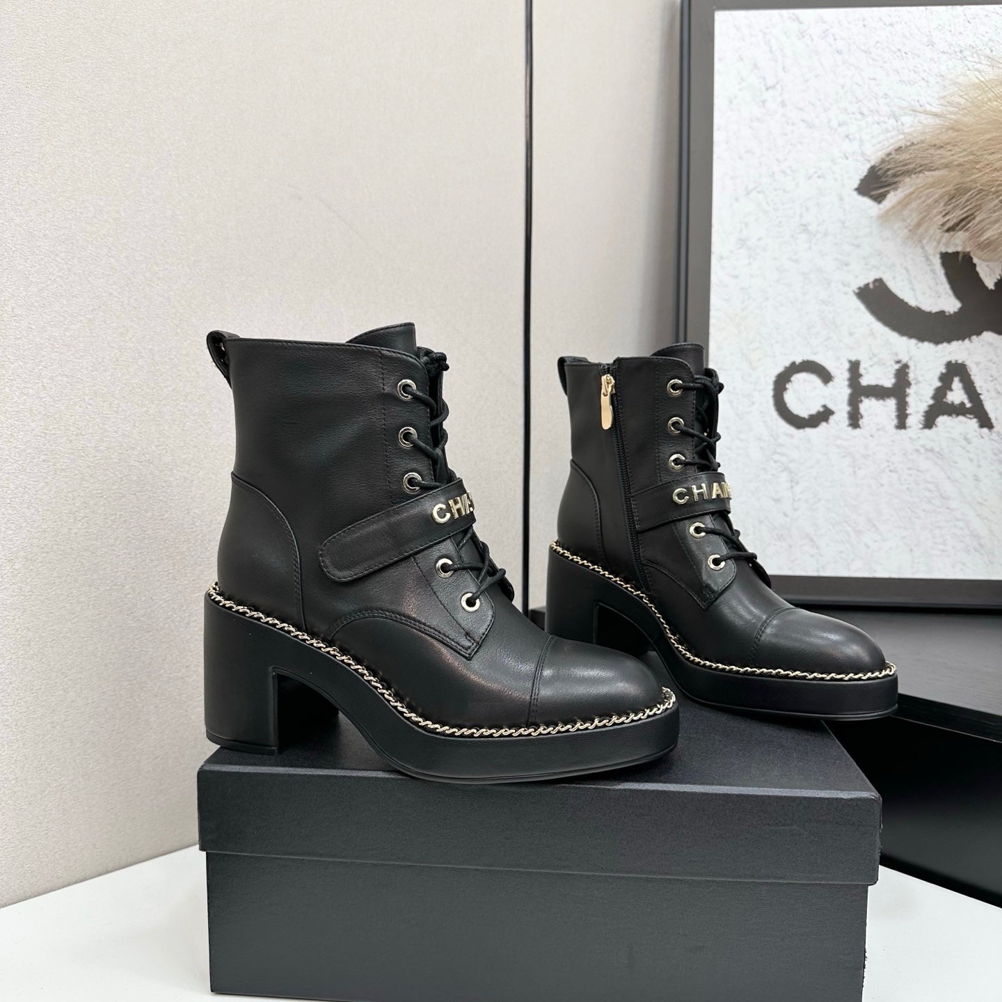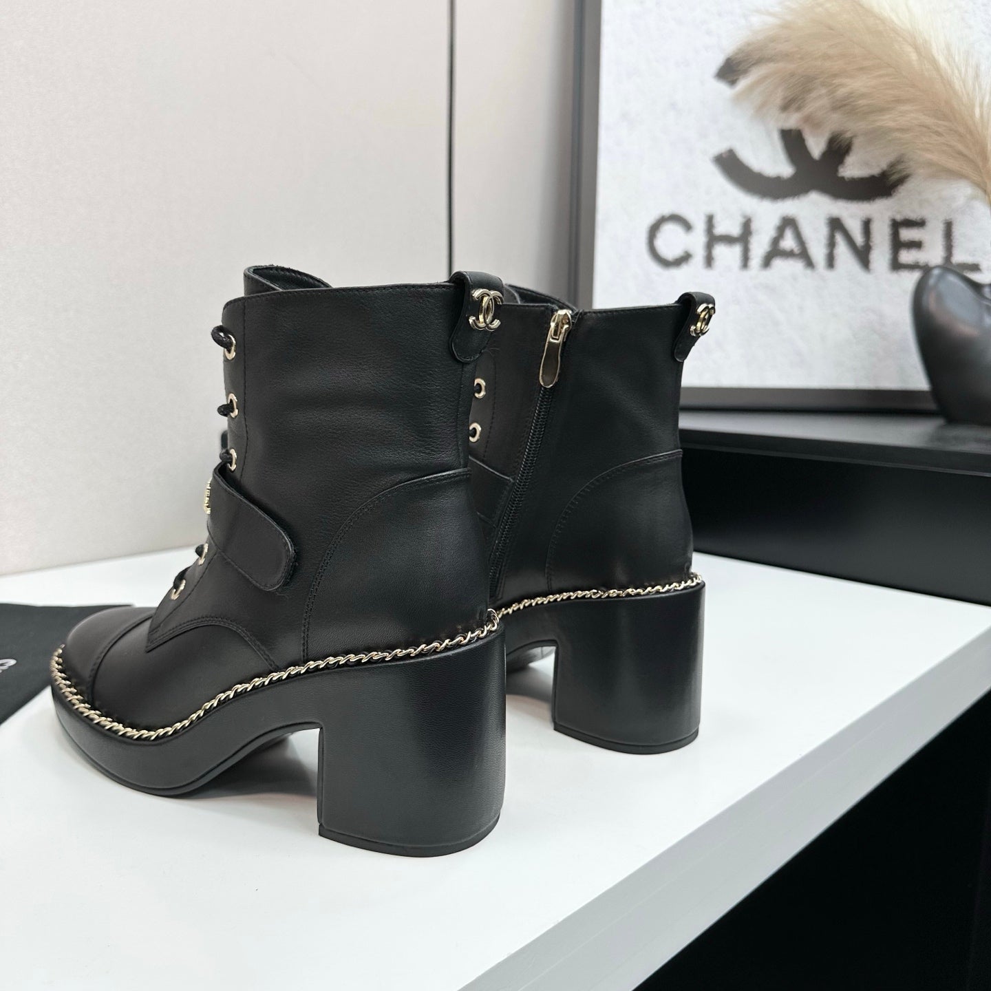 CHANEL 25S LACE-UP HEELED ANKLE BOOTS IN BLACK CALFSKIN