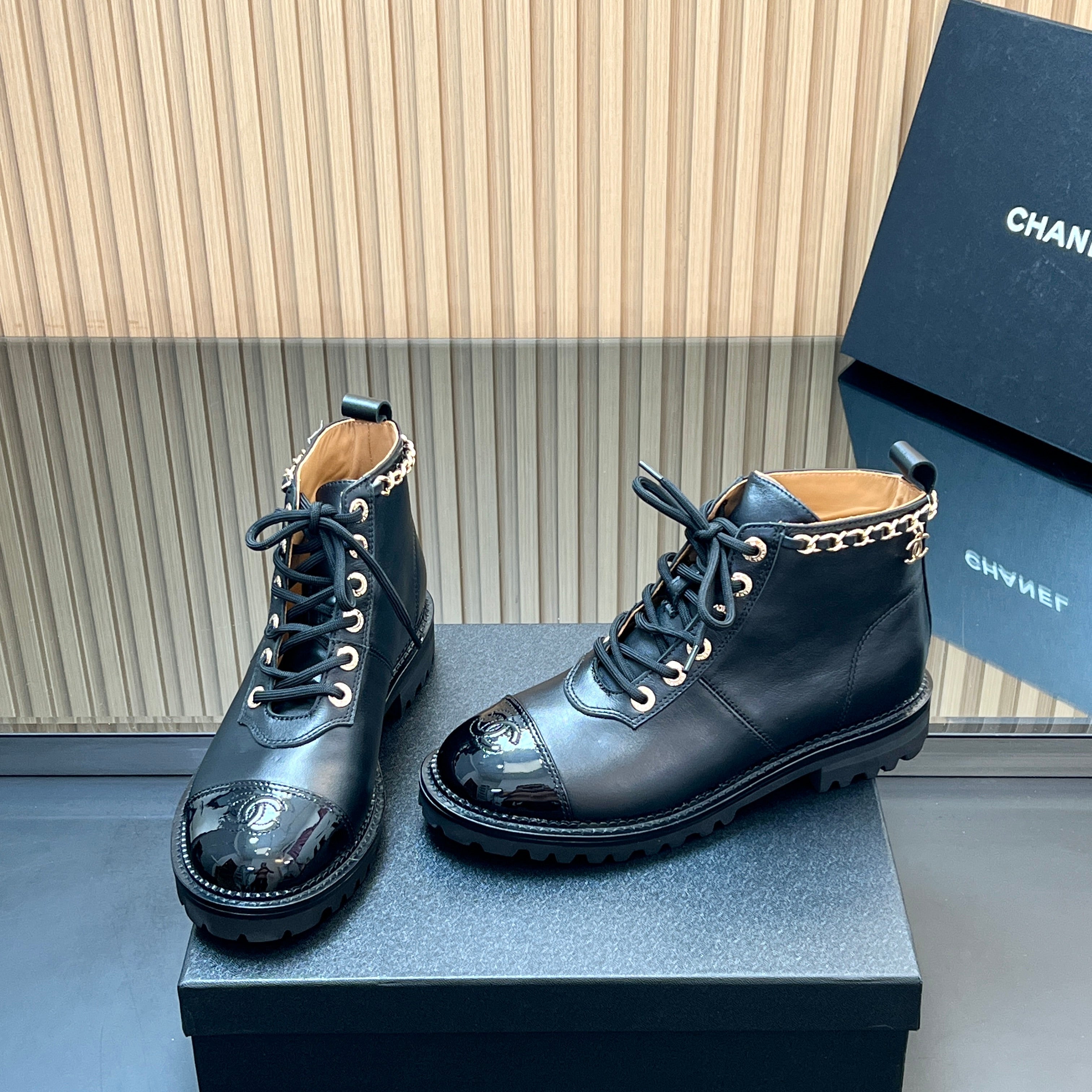 CHANEL 25S MARTIN LACE-UP BOOTS WITH CHAIN DETAIL IN BLACK CALFSKIN