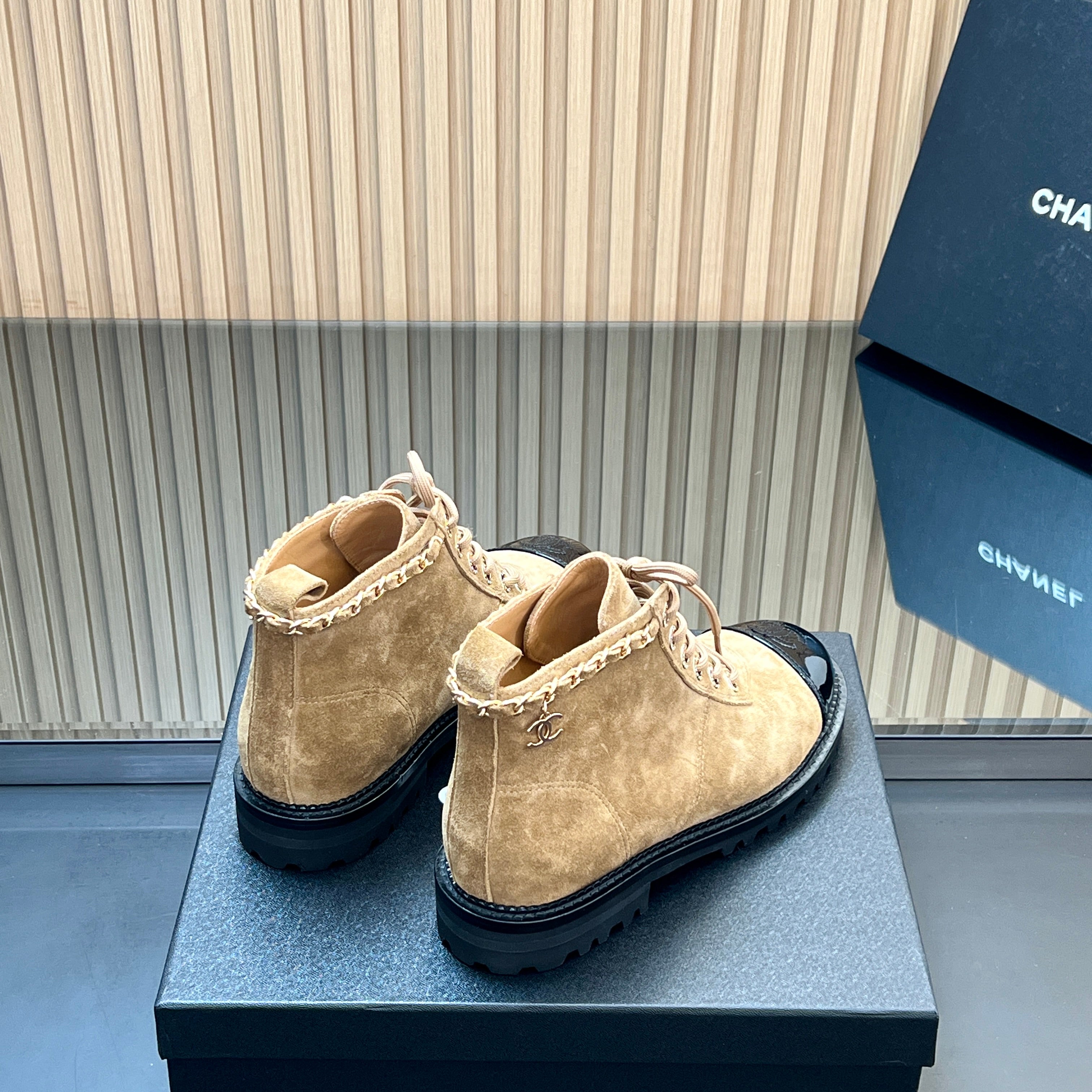 CHANEL 25S MARTIN LACE-UP BOOTS WITH CHAIN DETAIL IN LIGHT BROWN SUEDE