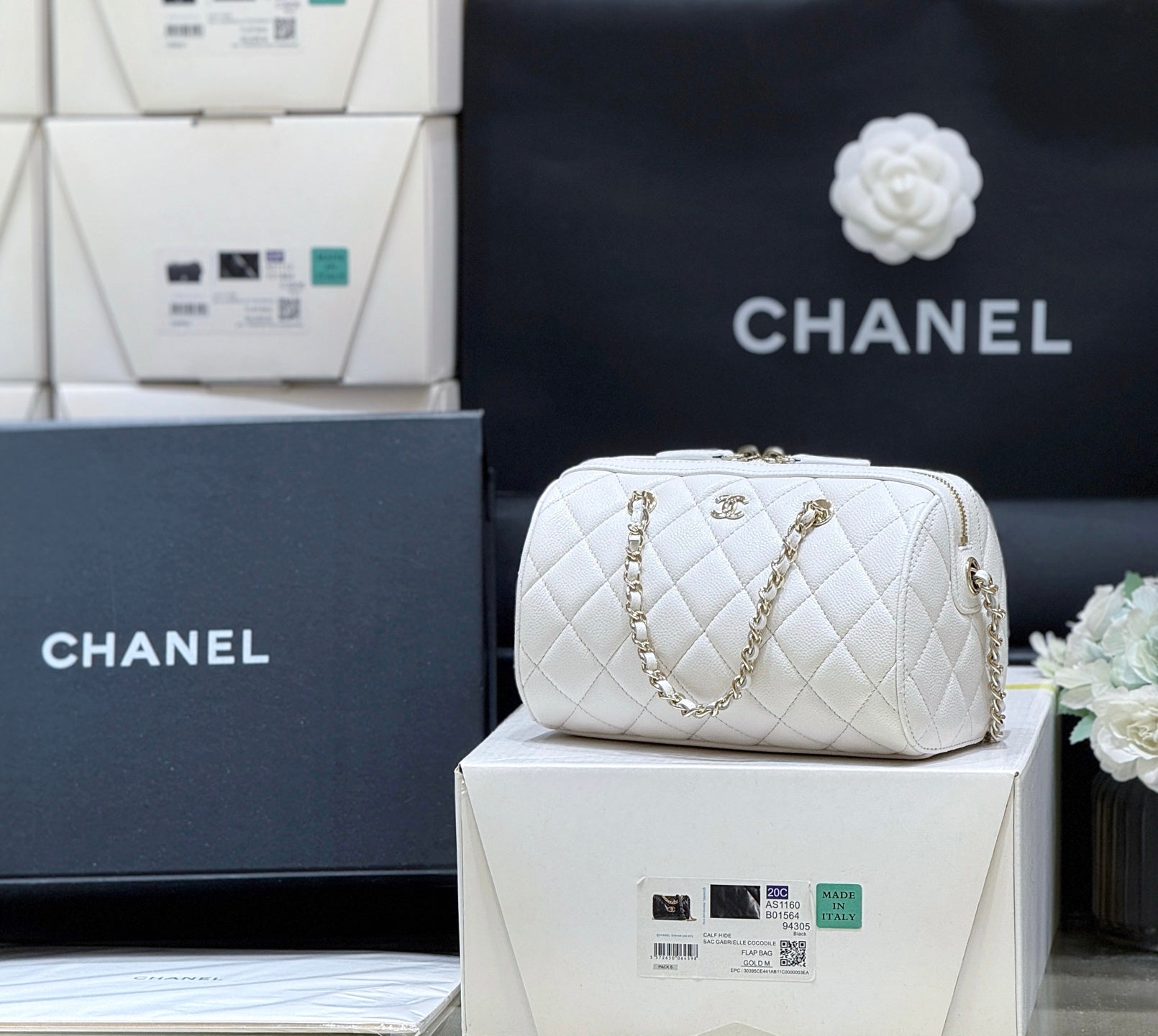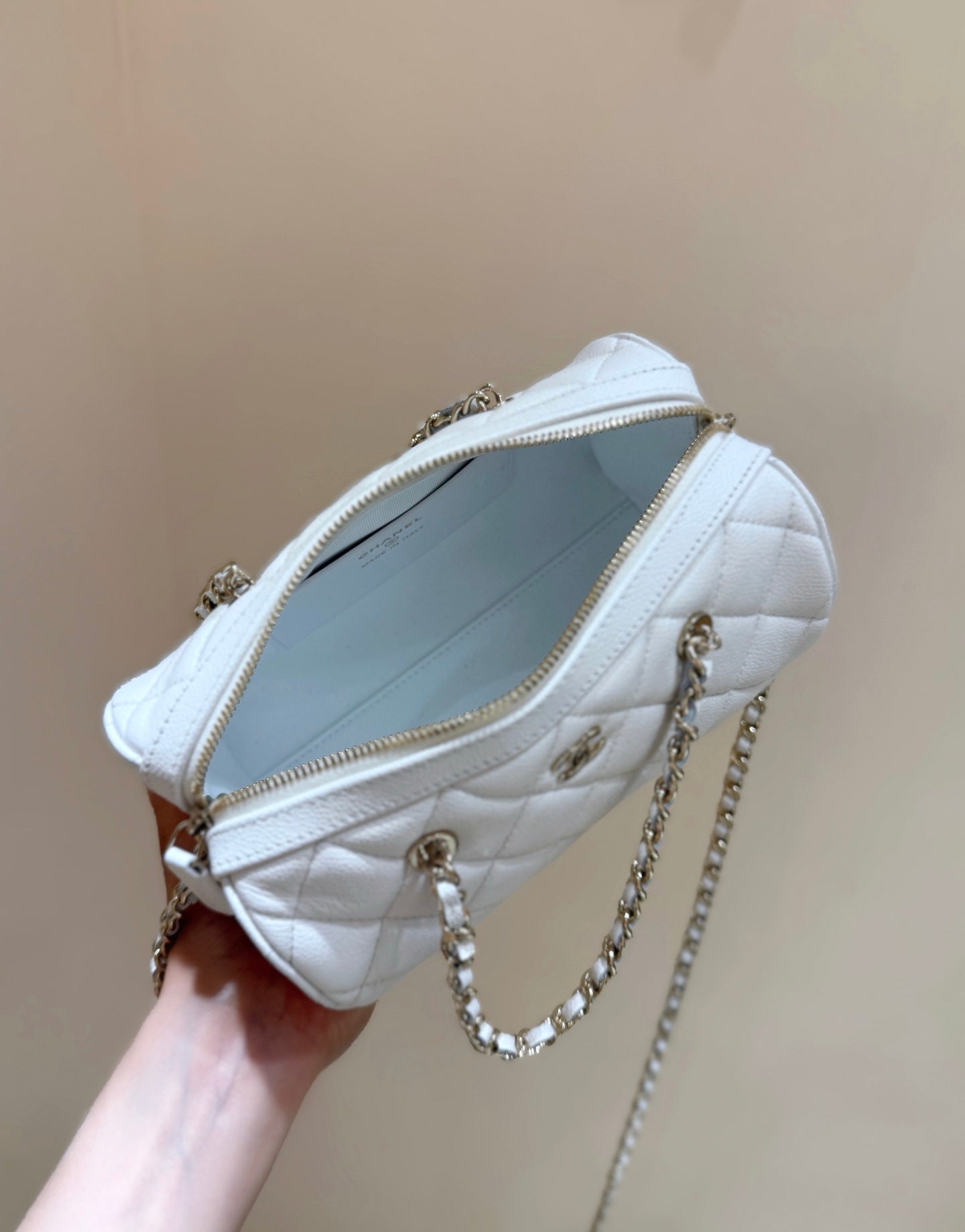 CHANEL 25S MINI BOWLING BAG 18 IN WHITE CALFSKIN GOLD HARDWARE